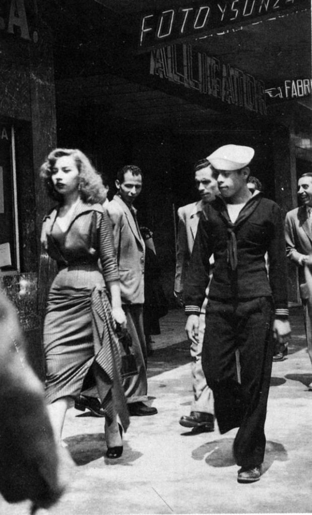 A women being watched and harassed in Mexico City, Mexico in 1950. There are 5 pictures of her being watched by men everywhere she went.