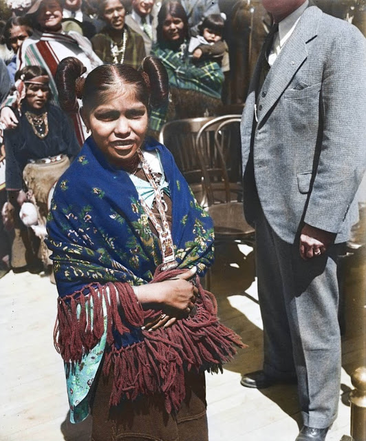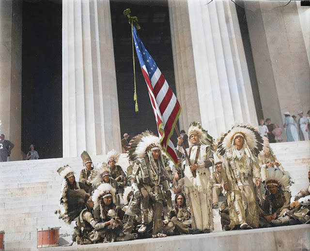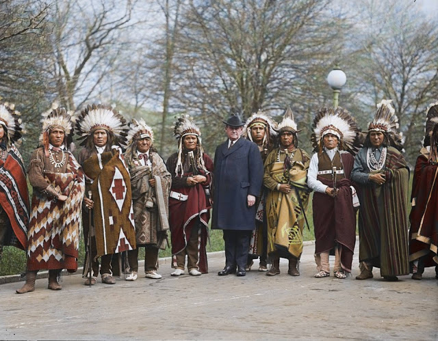1927 – President Calvin Coolidge poses for a picture with a group of Native Americans outside the White House, three years after the 1924 Indian Citizenship Act. STUNNING images of the indigenous Native Americans have been brought back to life through vivid colorisation. The remarkable pictures show the group during the 1920s, with some of the leaders meeting with then American president, Calvin Coolidge, at the White House. Native Americans, pictured here at the White House in traditional dress, were only granted full US citizenship in 1924 by the then President Calvin Coolidge, who was later granted honorary tribal membership by Sioux Chief Henry Standing Bear.A group of Native American men wearing their traditional attire while raising the Stars and Stripes at the Lincoln Memorial in 1936, 12 years after President Calvin Coolidge granted them US citizenship.President Coolidge with Native American tribes, 1924.Native Americans at the White House, circa 1929.Two Native American elders, dressed in traditional garb discussing policy with a member of President Coolidge’s staff. Native American girl. This remarkable photograph shows Native American men, women, and children in Washington D.C., to speak to President Coolidge. In 1924, Coolidge signed the Indian Citizenship Act, granting citizenship to indigenous people. Well-deserved: they had been in the country for generations before the “Americans” who automatically receive citizenship at birth.These Native American women traveled to Washington DC in 1924 to celebrate the newly-signed Indian Citizenship Act.This Native American elder was photographed around 1925.This Native American woman, center is meeting US President Calvin Coolidge in 1923 in advance of the Indian Citizenship Act.Native Americans posing for group portrait in 1915.