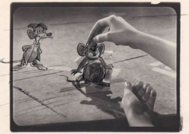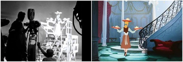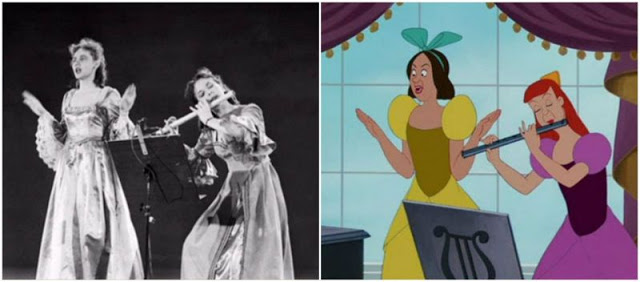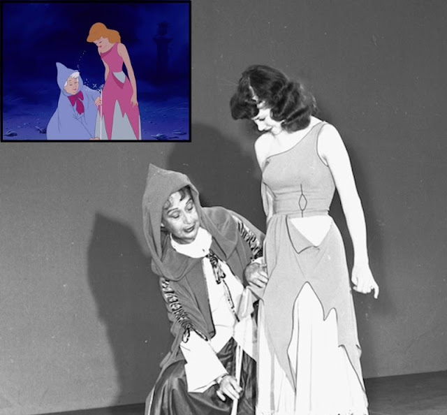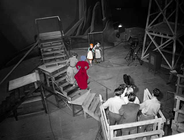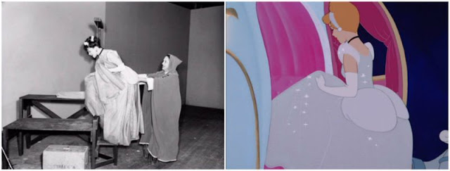 Here, Helene Stanley doing live action reference for Cinderella, with Jeffrey Stone as Prince Charming, Mary Alice O’Connor as the Fairy Godmother, and Eleanor Audley as Lady Tremaine. Helene also did live action for one of the stepsisters, Anastasia, alongside Rhoda Williams who modeled for Drizella.