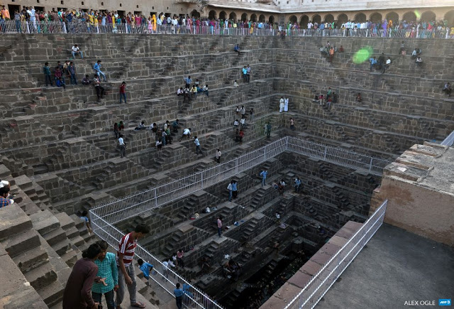 Chand Baori looks like anything but a well. This incredible square structure is 13 stories deep, and lined along the walls on three sides are double flight of steps. 3,500 narrow steps arranged in perfect symmetry descends to the bottom of the well 20 meters deep to a murky green puddle of water.