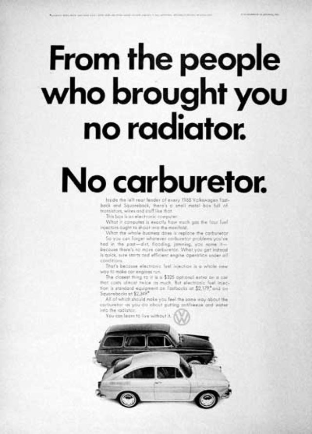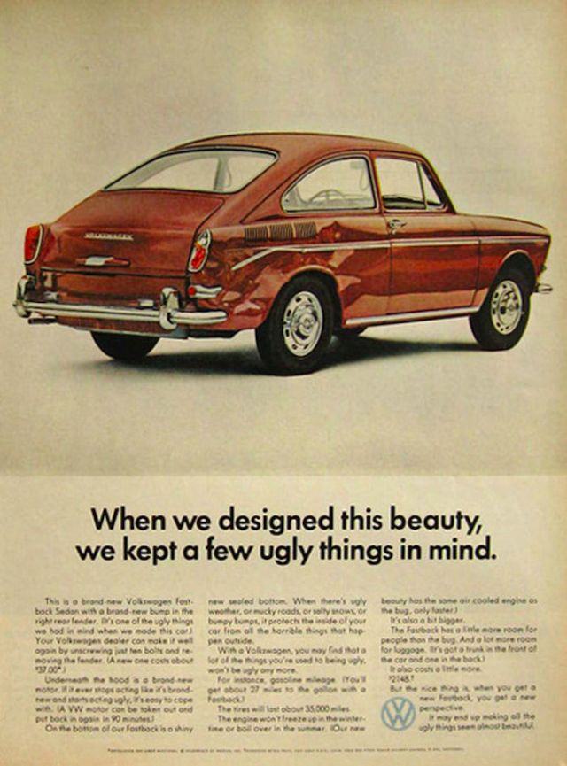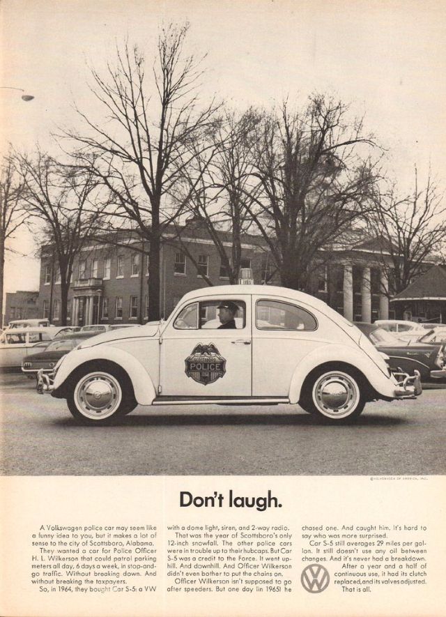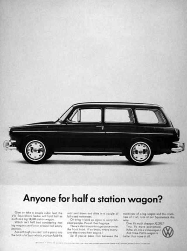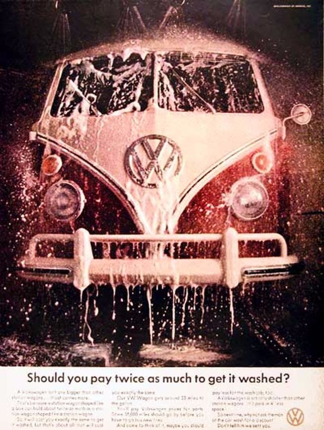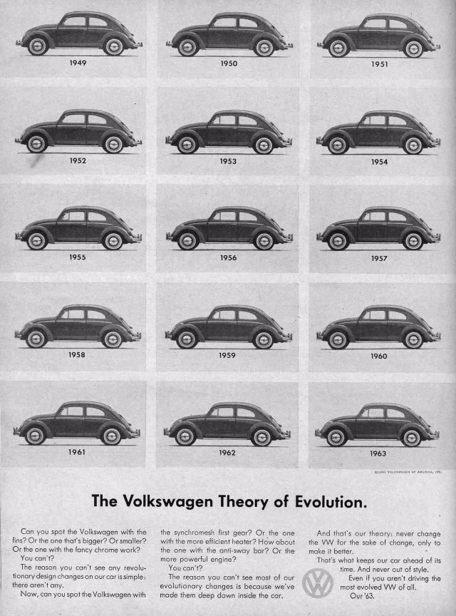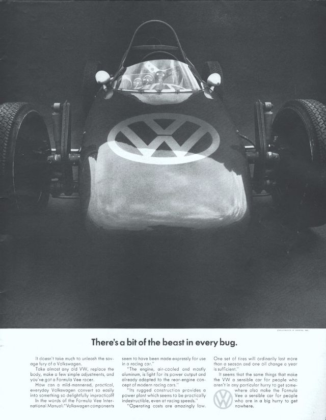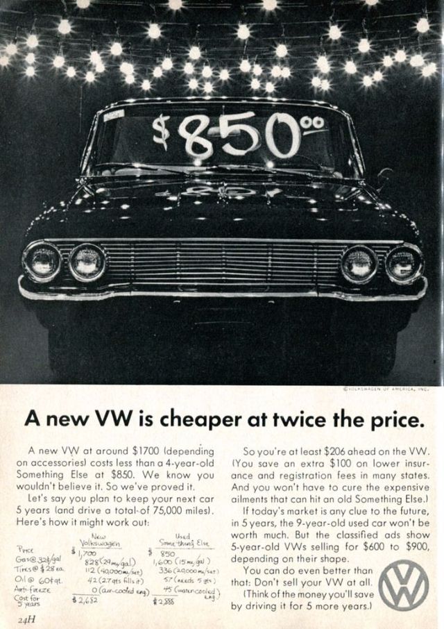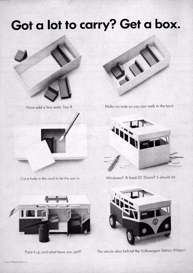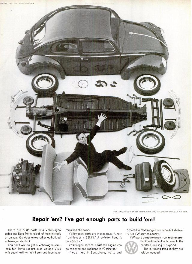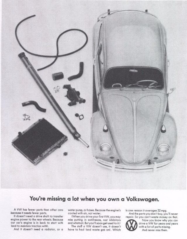 1960 Volkswagen Beetle Spare Parts original vintage advertisement. There are 5,008 parts in a Volkswagen Beetle. Each authorized dealer has them all in stock or on call.1961 Volkswagen Beetle original vintage advertisement. Photographed in black & white negotiating a huge puddle. “Last one to conk out is a Volkswagen.”1962 Volkswagen Beetle original vintage advertisement. Explains why you will never see an over-chromed two-tone Beetle. Photographed in black & white.1963 Volkswagen Beetle original vintage advertisement. Illustrated in black & white and features each model year from 1949 to 1963. “The Volkswagen Theory of Evolution.”1963 Volkswagen Beetle original vintage advertisement. Recounts the story of Albert Gillis who owned a 1929 Model A Ford for 33 years and chose a 1963 VW Bug as his next new car.1964 Volkswagen Beetle original vintage advertisement. “It makes your house look bigger.”1964 VW Volkswagen Station Wagon Bus original vintage advertisement. Photographed in black & white. “Got a lot to carry? Get a box.”1965 Volkswagen Beetle outline original vintage advertisement. “How much longer can we hand you this line?”1966 Volkswagen Beetle original vintage advertisement. Photographed in black & white. Explains the mathematics of how buying a new Beetle is cheaper in the long run than buying a used vehicle at half the price. Innovative marketing strategy given the time.1966 Volkswagen Beetle original vintage advertisement. Photographed in black & white. “You’re missing a lot when you own a Volkswagen.” Such as a driveshaft, radiator, water pump or hoses.1966 Volkswagen Beetle Police Car original vintage advertisement. Photographed in black & white. Purchased by the town of Scottsboro, Alabama for Officer H.L. Willkerson to run parking meter patrol. Rare VW ad!1967 Volkswagen Beetle original vintage advertisement. “We made the car go faster. And the engine go slower.” Photographed in black & white.1967 Volkswagen Beetle original vintage advertisement. Photographed in rich color. This Beetle floated for 42 minutes. Best copy: “…keep in mind… even if it could definitely float, it couldn’t float indefinitely. So drive around the big puddles. Especially if they’re big enough to have a name.”1967 Volkswagen Beetle original vintage advertisement. Photographed in black & white. Copy: “Pick the right day to test drive a VW and you’ll have the road to yourself”.1967 Volkswagen Bus original vintage advertisement. Photographed in vivid color at the local car wash.1967 Volkswagen Fastback Sedan original vintage advertisement. Photographed in vivid color. Replacement rear fender: about $37 not including labor. Extremely innovative ad to show a damaged vehicle.1967 Volkswagen original vintage advertisement. Pictured are the VW Beetle, VW Squareback and the 21-window Bus. It comes in three economy sizes.1967 Volkswagen Formula Vee car original vintage advertisement. Photographed in black & white.1967 Volkswagen Squareback Sedan original vintage advertisement. Photographed in black & white.1968 Volkswagen VW Beetle original vintage advertisement. Photographed in black & white. “Live below your means.1968 Volkswagen Beetle original vintage advertisement. Photographed in black & white. Now available with stick shift automatic transmission.1968 Volkswagen Bus original vintage advertisement. Photographed in vivid color. And the beans? There are exactly 1,612,462 beans in this bus!1968 Volkswagen Fastback & Squareback original vintage advertisement. Photographed in black & white.