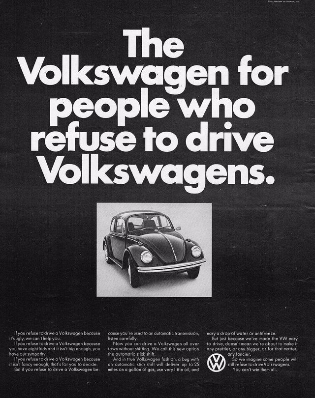 The corporate headquarters and factory that produced Volkswagens was located in Wolfsburg, Germany. Because Volkswagen’s advertising budget in 1960 was only $800,000, DDB’s bare-bones, black-and-white approach, coupled with a projected common theme of irreverence and humor, fit Wolfsburg’s needs well. Each Volkswagen ad was designed to be so complete that it could stand alone as a viable advertisement, even without addressing all aspects of the automobile.
