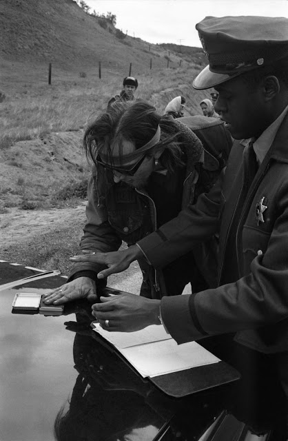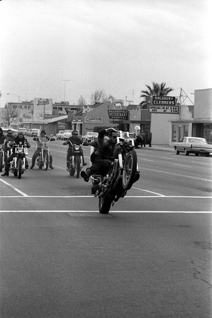 Hells Angels, California, 1965.Hells Angels, California, 1965.Big D, a member of the San Bernardino, a.k.a, “Berdoo” Hells Angels, during a ride from San Bernardino to Bakersfield, California, 1965.Inside the Hells Angels’ San Bernardino clubhouse, 1965.“Little Jim” drinks beer from a waste basket at the Angels’ clubhouse in San Bernardino, 1965.Hells Angels’ “old ladies,” California, 1965.Two “Berdoo” Hells Angels clown for Bill Ray behind a bar during a stop on their run from San Bernardino to Bakersfield, 1965.Hells Angel “Hambone” poses during a ride from San Bernardino to Bakersfield, Calif., 1965.Hells Angels and locals outside the Blackboard Cafe in Bakersfield, Calif., 1965.Hells Angels, their old ladies and hangers-on outside the Blackboard in Bakersfield, California, 1965.Hells Angels cruise north from San Bernardino to Bakersfield, 1965.A man in Bakersfield, Calif., casts what appears to be an appraising eye over the Hells Angels’ Harley-Davidsons, 1965.Hells Angel, seated on his bike, 1965.Hells Angel, California, 1965.Sonny, the leader of the San Bernardino Hells Angels, gets stitches in his head after crashing his bike, California, 1965.Women — including one with a bandaged nose — hang out in a bar while bikers gather in a separate room, California, 1965.A sheriff’s officer keeps an eye on the proceedings outside a bar that the Hells Angels have made their headquarters-away-from-home during their San Bernardino-to-Bakersfield run, 1965.Two women riding with the Hells Angels hang out at a bar in 1965.Hells Angels, California, 1965.Outside the Blackboard Cafe at night, Bakersfield, Calif., 1965.A Hells Angels “old lady,” 1965.A teenager seems drawn, like a moth to a flame, by the Angels and their machines, California, 1965.Two “reputable” motorcyclists photograph the Hells Angels, 1965.During their ’65 run to Bakersfield, the Angels pushed their way into a motorcycle hillclimb, in which bikers race up an often insanely steep incline. The Angels wanted to take part; organizers said no (but finally relented). Above: Hambone, in his ever-present fur hat, jaws with organizers while sheriff’s officers listen in.A biker named Roseberry sports a “one percenter” patch — a badge of honor for the Angels and other motorcycle clubs whose members revel in and celebrate their outlaw status, 1965.A biker named Roseberry is fingerprinted, 1965.An Angel is frisked. Cops were mainly looking for his stash of unrolled marijuana, and didn’t find any. It was inside the seat pad of the bike he was riding.A Hells Angel — with his old lady holding on tight — pulls a wheelie in downtown Bakersfield, California, as his friends watch, 1965.Bikers (including Sonny, left, with a bandaged head) and their old ladies, California, 1965.Biker chick, California, 1965.“Buzzard” and an old lady, California, 1965.A Hells Angel salute, 1965.“Buzzard” prepares to leave Bakersfield as cops and townspeople watch, 1965.