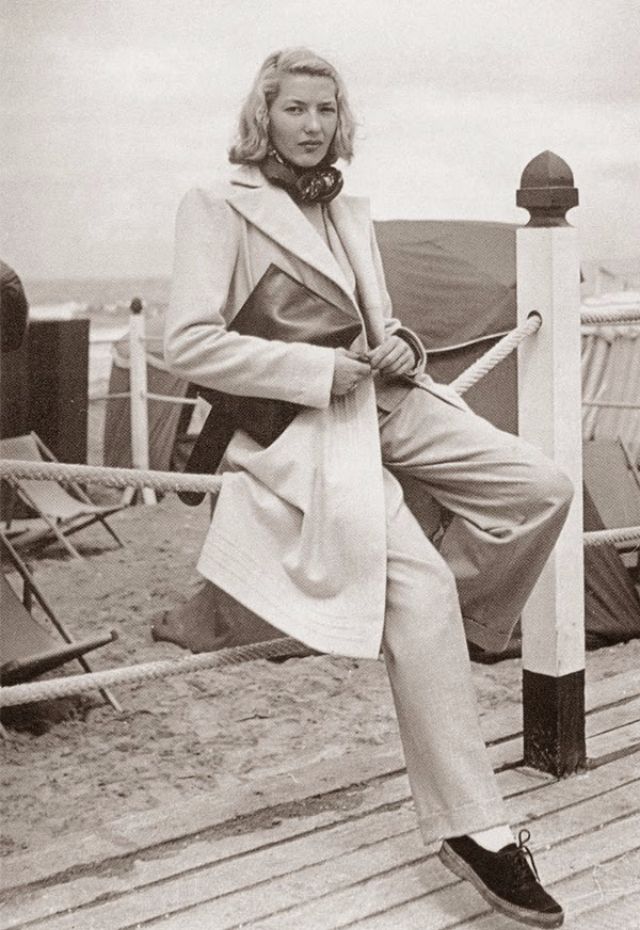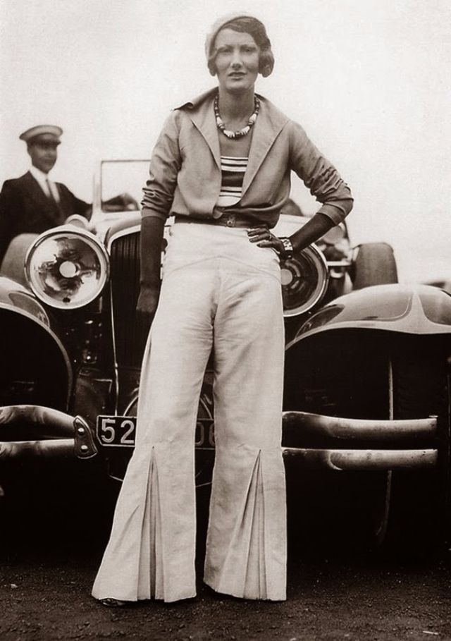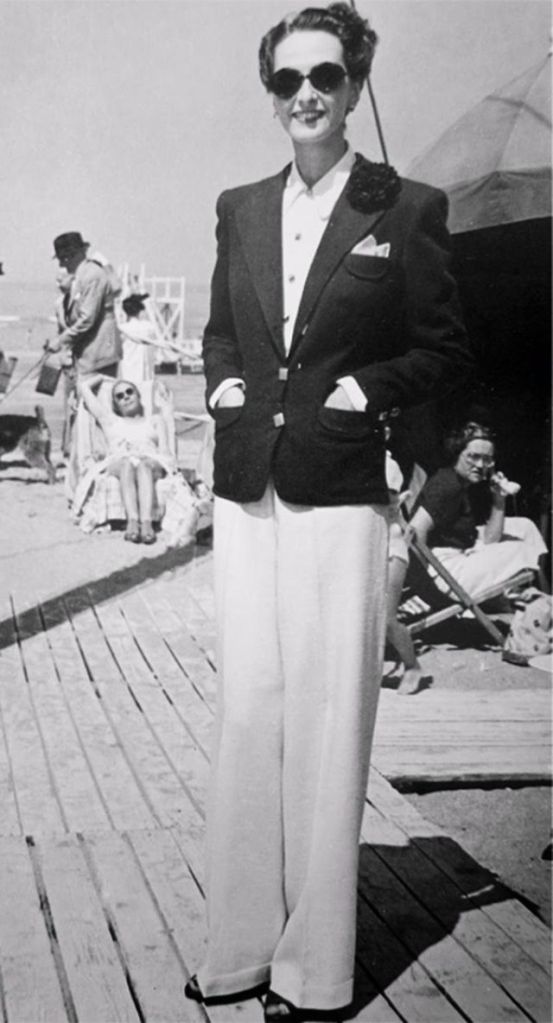 For day wear a pair of white or navy blue high waist, wide legs pants with a nautical or sailor look were trendy.