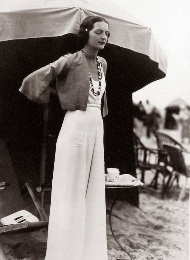 On the beach women wore soft, flowing, very wide leg Beach Pajamas or palazzo pants. They were soft pastel colors or big geometric prints such as stripes and checks. Many had attached overall straps or were a full jumpsuit.