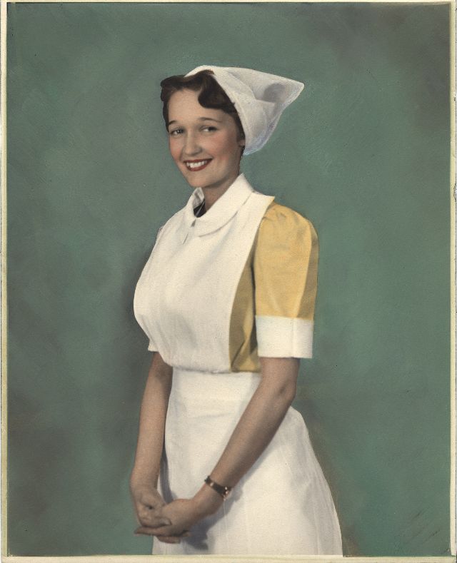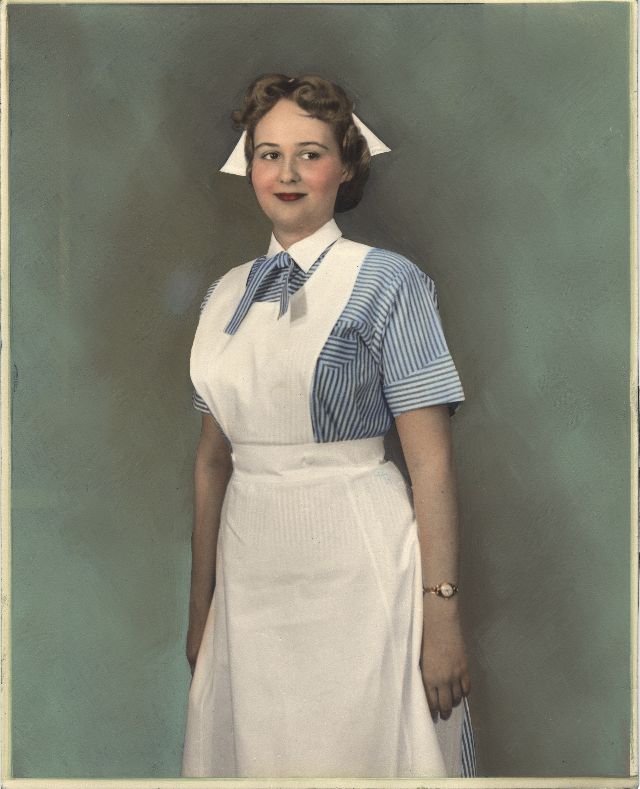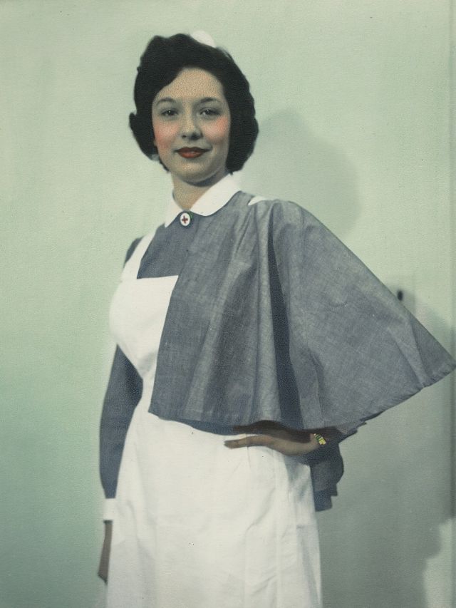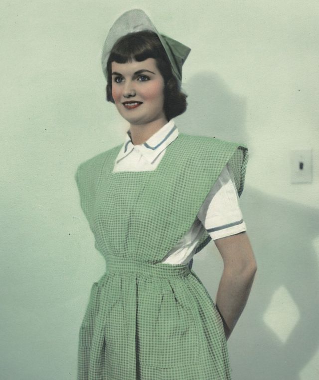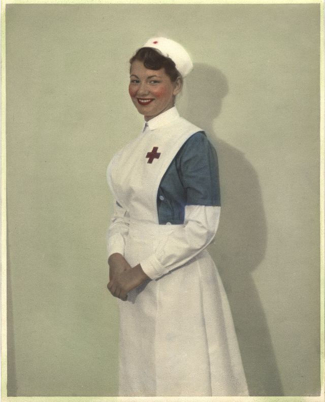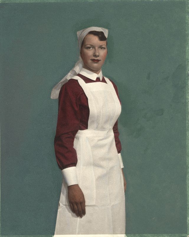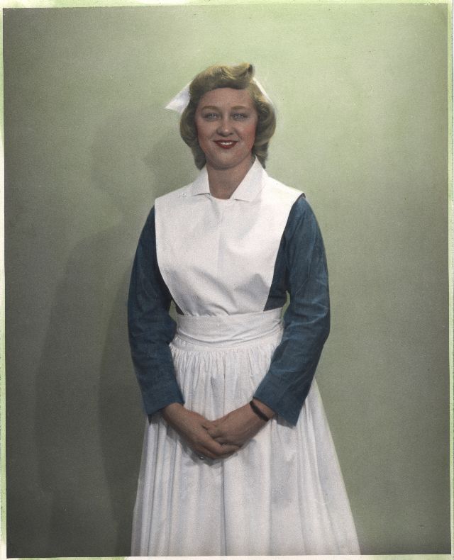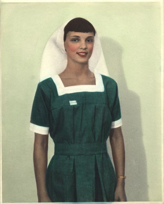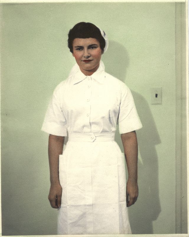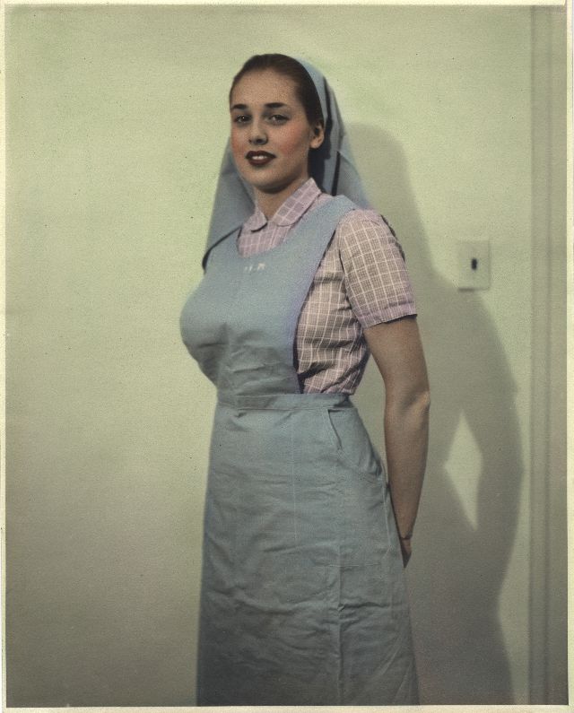 At the same time the photos have the look of advertisements. In the mid-twentieth century companies began manufacturing more smartly tailored uniforms, and they used women with modern hairdos and makeup who projected a sense of female independence and self-assurance to model them. Fussy styling and accessorizing was avoided; uniform design was meant only to echo the latest fashions while maintaining the modesty of the nurse.