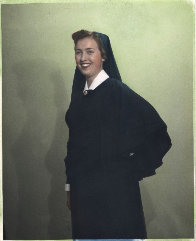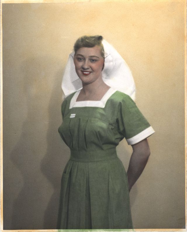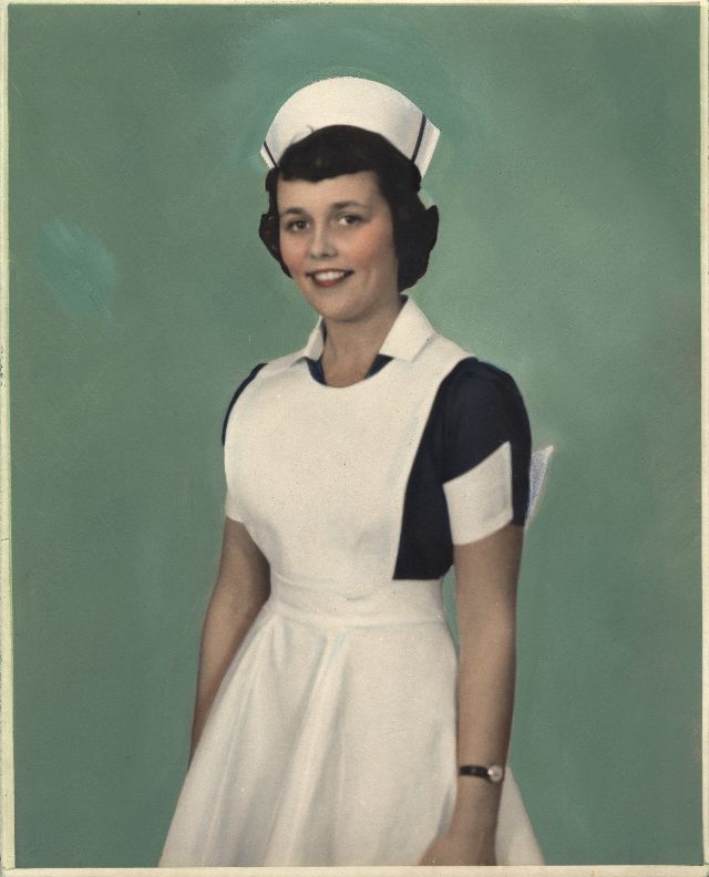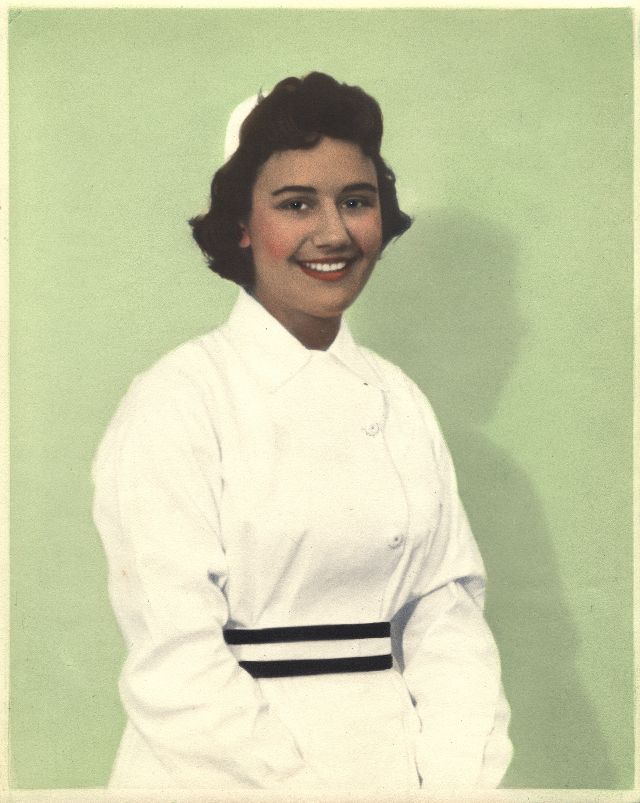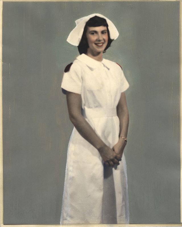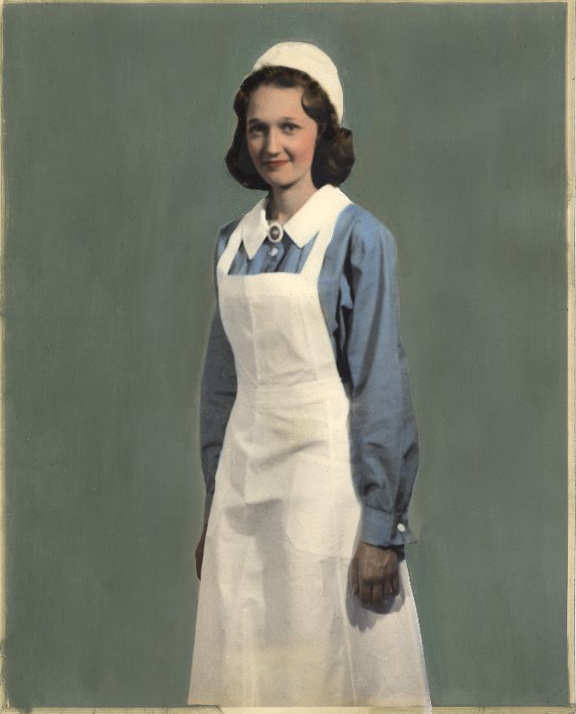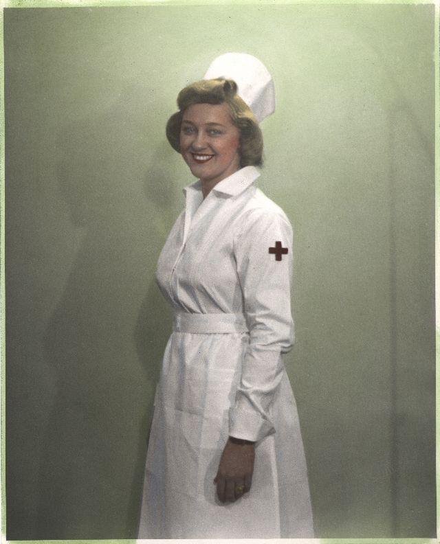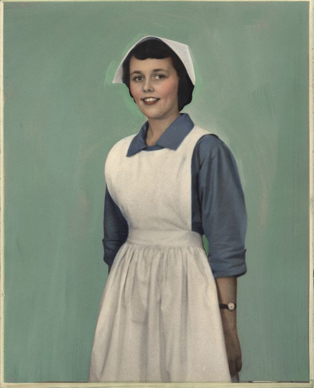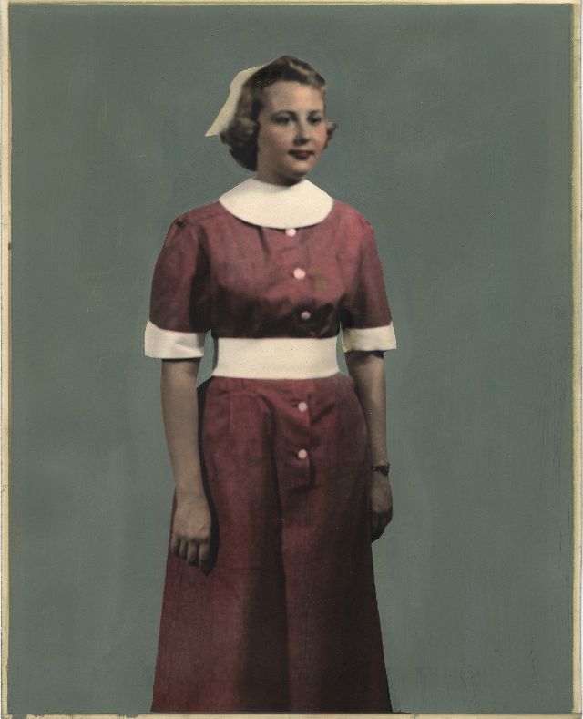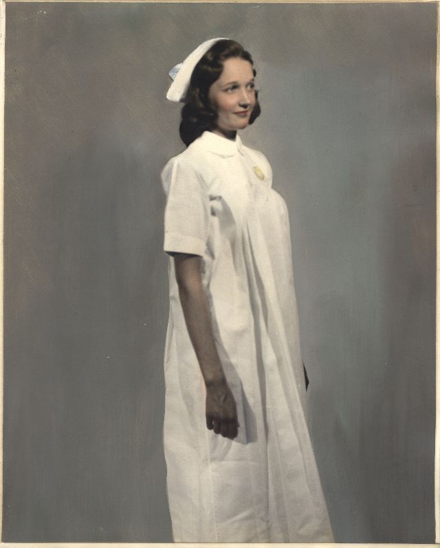 At the same time the photos have the look of advertisements. In the mid-twentieth century companies began manufacturing more smartly tailored uniforms, and they used women with modern hairdos and makeup who projected a sense of female independence and self-assurance to model them. Fussy styling and accessorizing was avoided; uniform design was meant only to echo the latest fashions while maintaining the modesty of the nurse.