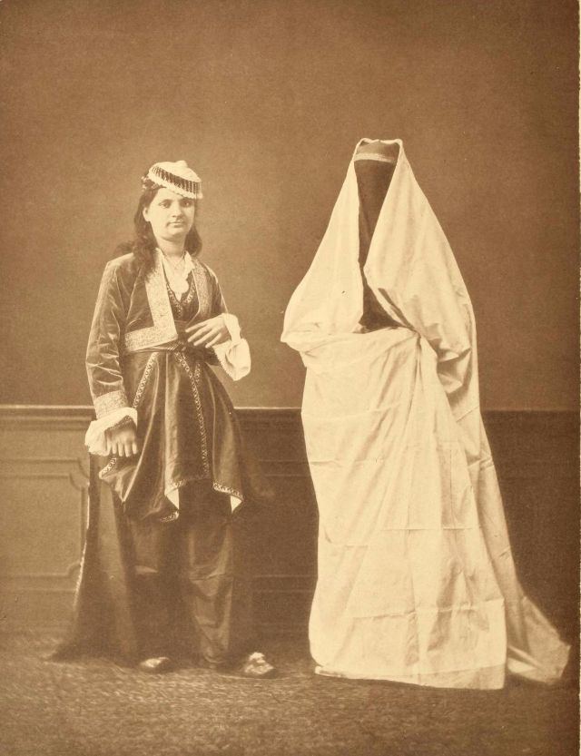 Women’s everyday wear was salvar (trousers), a gömlek (chemise) that came down to the mid-calf or ankle, a short, fitted jacket called a hirka, and a sash or belt tied at or just below the waist. For formal occasions, such as visiting friends, the woman added an entari, a long robe that was cut like the hirka apart from the length. Both hirka and entari were buttoned to the waist, leaving the skirts open in front. Both garments also had buttons all the way to the throat, but were often buttoned only to the underside of the bust, leaving the garments to gape open over the bust. All of these clothes could be brightly colored and patterned. However, when a woman left the house, she covered her clothes with a ferace, a dark, modestly cut robe that buttoned all the way to the throat. She also covered her face with a variety of veils or wraps.
