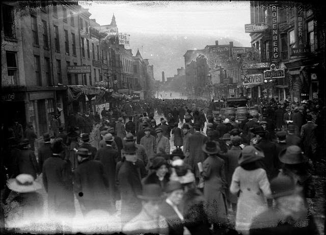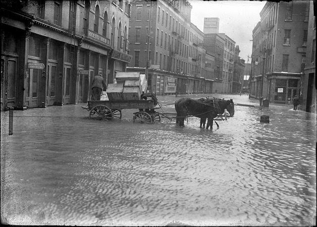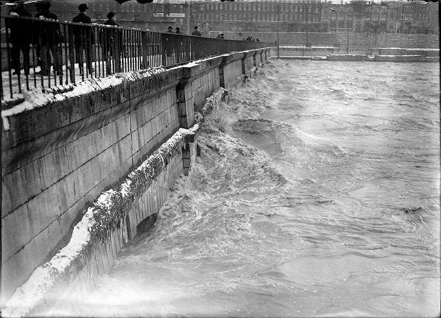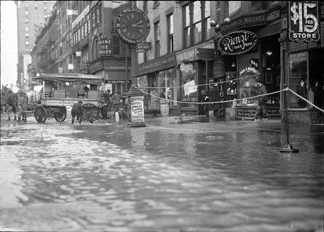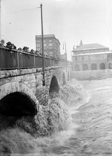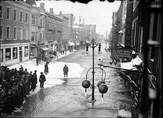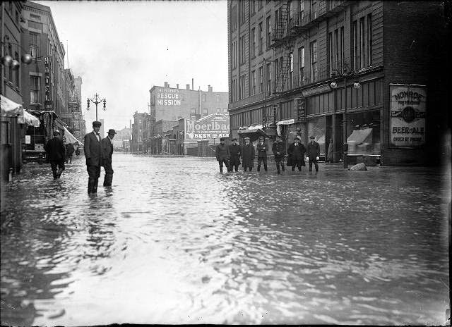 A large crowd is gathered on Front Street to look at the flood at the other end of the street. Varlan’s Hotel, Rosenberg’s Pawnshop, Charles Adam’s Sons Grinding, J.G. Zweigle’s Sons, W.T. Bridle Furniture, William Pigeon Shoes, Hyman Davis Shoes, Genesee Provision Company, Myers Department Store, and the F.H. Loeffler Company are visible in the photo. March, 1913Spectators line the Court Street Bridge railings to watch flood waters beating against the arches of the bridge, below the dam. March, 1913.A group of men are pictured in and around a rowboat on Front Street, during the flood of 1913. March, 1913.A group of people are pictured in and around a rowboat in the middle of flooded Front Street. They are members of a rescue crew that has saved a woman from a flooded building. All records for high water were broken in this flood. March, 1913.A Front Street policeman patrols his beat in a rowboat during the 1913 flood. He and another man row past the Hotel Richmond at the corner of Front and Market Streets. March, 1913.A horse and wagon stand in the middle of Mill Street during the 1913 flood. This is Mill Street at Andrews Street. Rochester Thread Company, F.A. Sherwood Company, John M. Forster Company, and Fahy Market are visible in the photo. March, 1913.Men are standing ankle-deep in water on Front Street. On the left is the Atlantic Supply House and on the right is the People’s Rescue Mission. March, 1913.Men stand ankle deep in flood water on Front Street. They are in front of the Rochester Poultry & Commission Company. The People’s Rescue Mission is in the background. March, 1913.Two men stand ankle-deep in water on Front Street. They are carrying a coffee pot and baskets. On the right side of the photograph a man and a woman look out of a doorway. March, 1913.Three men ride a rowboat down flooded Front Street. They are passing J.G. Zweigle’s. March, 1913.The flood has filled the store cellars with water on Main Street East at Graves Street. All the first floors are submerged as well. A horse and wagon are at the curb and the men are standing on the sidewalk. F.P. Van Hoesen Company, Rienzi (a bar), J.C. Wilson Company, the Postal Telegraph Cable Company, and the Fifth Avenue Clothes Shop are visible in the photo. March, 1913.Rochesterians viewing the water on Front Street. Ice has formed in pockets on the flooded street. The sign for Charles Adam’s Sons, Inc.Genesee River in high water stage, showing the backs of Front Street buildings. This is believed to be a depiction of the flood of March 28, 1913. Myer’s Department Store, Charles Adam (grinding), and Zweigle’s (sausage maker and saloon) are visible in the photo. Weis & Fisher Company (furniture and carpets) is in the right background at 297 Brown Street. The Powers Building tower is in the upper left corner. March, 1913.A group of people stand at the edge of the flood water on Front Street in front of the Genesee Provision Company. A rope cordons off the street near Charles Adam’s Grinding and the William H. Larkin Hotel. March, 1913.Two men are stopped in a Ford car during the flood on Front Street. One man is holding a camera and other men stand in the street in ankle-deep water. March, 1913.This view is a close-up of flood water going into the shops on Front Street. There is a Bartholomay Beer sign on the post. March, 1913.A man sits in a Ford automobile, which has water halfway up the wheels. This is Plymouth Avenue, which has been completely flooded by the Genesee River. March, 1913.The Durand boathouse in Genesee Valley Park shows major flood damage. The Genesee River, again peaceful, flows past it. March, 1913.A man leans out of a car to observe the damage done on River Road.People, including one man with a horse and buggy, stand at the edge of the flood on Front Street. Dave Solomon, Pawnbroker and Auctioneer; Charles Adam’s Sons, Incorporated, Grinding; Zweigle’s; and (probably) the Genesee Provision Company are visible in the photo. March, 1913.Men climb up a ladder from a rowboat to deliver food to families marooned on the upper floors of Rochester’s business section. The men are pictured in front of Jacob Goldstein’s Lodging House and J.C. Vine’s Columbia Hotel. March, 1913.Pedestrians throng the sidewalks of the Court Street Bridge to see the flood waters, as a few horse-driven carriages and automobiles drive past. March, 1913.Flood waters swirl around the aqueduct near Broad Street, looking toward South Avenue. March, 1913.Police hold back a large crowd at the water’s edge on flooded Front Street. March, 1913.