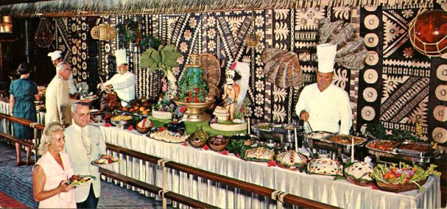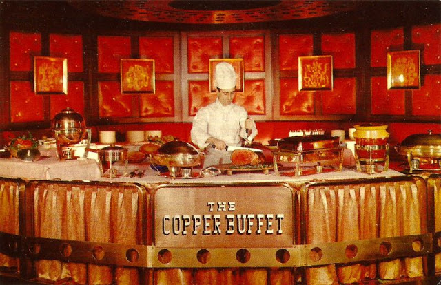 The buffet’s time had truly arrived in post-WWII America. Enjoying an unprecedented economic boom, the “table of plenty” fit perfectly within this period. Gone were the Depression-era days of meager portions, and gone were the WWII days of rationing. In Cold War America, tables bent beneath the weight of the mighty buffet.