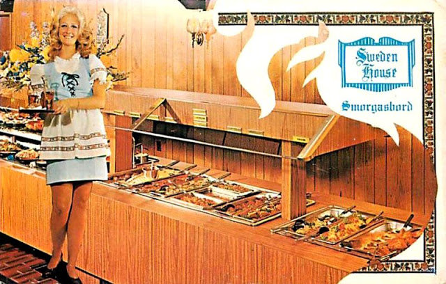 Aside from Scandinavian immigrants, the word “smorgasbord” wasn’t a term known in the United States until the 1939 World’s Fair in New York, where it was served at the Swedish Pavilion. From there, various restaurants started touting their own versions of the Smörgåsbord; until, by the mid-sixties, the term had become generalized to mean simply “buffet”.