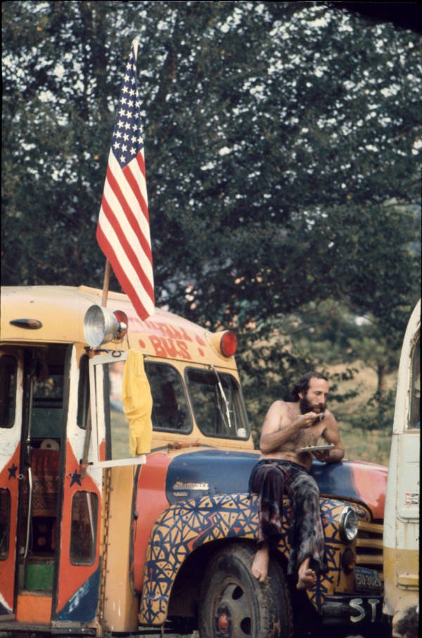 The Merry Pranksters — author Ken Kesey’s collective of LSD disciples — atop their bus, Further, getting ready to take LSD across America. Date and location unspecified.Hippies dance during a “love-in” in Los Angeles on Sept. 22, 1968.At Woodstock, a man eats lunch on the hood of the school bus. 1969.The Merry Pranksters arrive at Woodstock with a school bus full of LSD. 1969.Ken Kesey poses for a photo with a young flower child. La Honda, California. 1971.A Merry Prankster called “The Hermit” touches up the paint on the magic bus, Further. San Francisco, California. 1966.Merry Prankster and author Stewart Brand sets up instruments on top of the group’s magic bus. San Francisco, California. 1966.A couple waits for the start of the Monterey Pop Festival in California. 1967.Altamont Free Concert. 1969.Hippie family living in a painted bus. Date unspecified.A young hippie sits cross-legged in a New York City park. 1969.Hippies passing a joint at a commune. Date unspecified.Music fans gather in Hyde Park to see the Rolling Stones in concert. 1969.A Hells Angel relaxes on the scaffolding during the Isle of Wight music festival. 1970.Hippies relaxing on the beach. Date unspecified.A female dancer, decorated in fluorescent body paint and with feathers in her hair, attends an event at San Francisco’s Avalon Ballroom. 1967.Hippies gathered around a large tree at San Francisco’s Golden Gate Park. Date unspecified.Ron “Pigpen” McKernan of The Grateful Dead. Date unspecified.Concert-goers lend a helping hand to push a stalled VW microbus at the Ozark Music Festival in Sedalia, Missouri. 1974.Woodstock. 1969.An anti-war demonstrator at the University of California, Berkeley throws a tear gas canister at police. 1970.A hippie couple looks out to sea along the beachfront. California. 1967.Young people on their way to Woodstock. 1969.Woodstock attendees hug each other. 1969.Woodstock attendees sit at their camp site on the festival grounds. 1969.Hippie couple stands together at Woodstock. 1969.Hippies together at Woodstock. 1969.View of life inside “Drop City,” an experimental, countercultural community based around cheaply constructed geodesic dome structures. Trinidad, Colorado. 1967.A gathering of hippies at Stonehenge to mark the summer solstice. Date unspecified.American political and social activists Abbie Hoffman and Anita Kushner sit cross-legged on either side of Linn House (center), a “Boo-Hoo” leader of the Neo-American Church, devoted to the use of psychedelic drugs. He performed their wedding ceremony in Central Park, New York. 1967.A nude woman stands before a crowd at a concert in London’s Hyde Park. 1970.A female demonstrator offers a flower to a military policeman during an anti-war protest at the Pentagon. 1967.A Washington, D.C. policeman arrests a demonstrator during a protest against the Vietnam War. 1971.James Edward Baker, known as Father Yod, was the leader of Los Angeles’ Source Family commune. Date unspecified.Members of the Source Family form a human chain. Date unspecified.Ecstatic fans give in to the music at the Isle of Wight festival. 1969.Hippies dancing at East Afton Farm, near Freshwater, during the Isle of Wight festival. 1970.Attendees of the Isle of Wight festival. 1970.A group of dancing hippies. Location unspecified. Circa 1970.Hippie couple in San Francisco, 1967