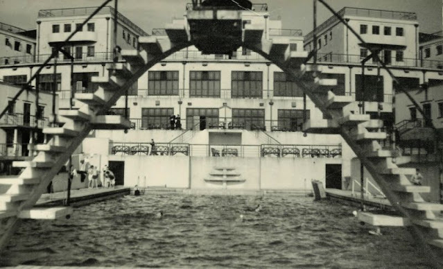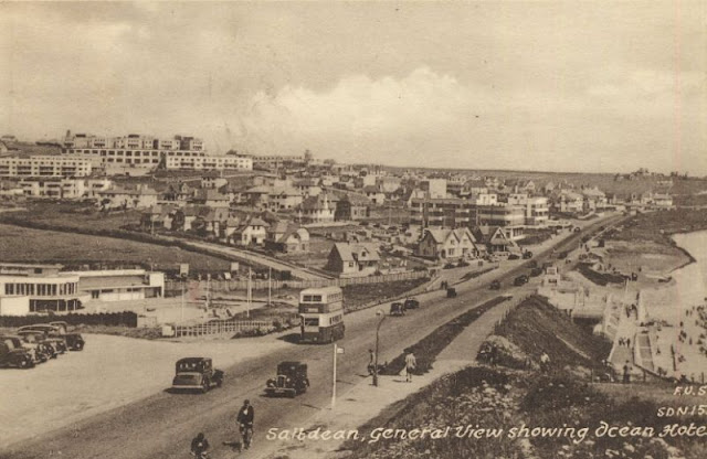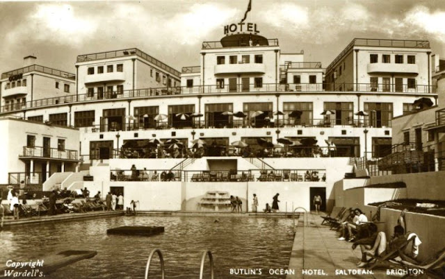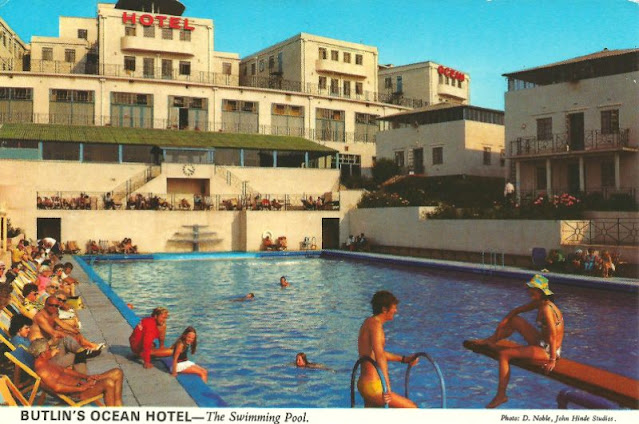Opened in 1938 the Ocean Hotel occupied a site of around 4 acres with 344 bedrooms and a dining hall that could seat 300 people. It consisted of a main building shaped like a crescent which contained the whole of the public rooms and some of the bedrooms, and there were six other buildings which contained bedrooms and bathrooms only. The hotel was so arranged that during the winter season the six detached blocks could be closed down and the main building, with its 130 bedrooms, run as a separate hotel. An outdoor swimming pool (later enclosed) was built between the buildings.