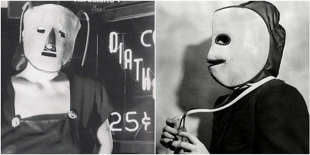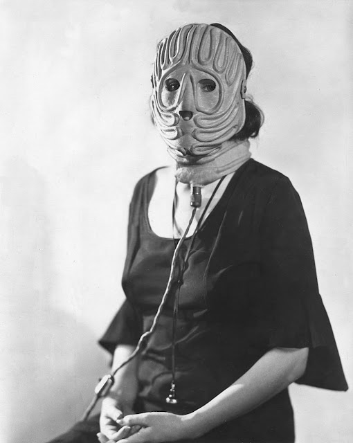Treatment begins by cleansing the face, which is then dried with tissue and the mask applied. The chin electrode is first fixed in place by an adjustable rubber strap. In similar manner, double cheek electrode bands and the forehead electrode band is fixed. The cables, which are heavily insulated, are then attached and circuits closed. The resulting sensation is a pleasant, deep-reaching warmth; the consequence of a 10 minutes controlled application is a thorough enduring stimulation of skin and sub-cutaneous tissues. This intensive stimulus is not to be achieved by massage, or any available lotion, and is under full control of the operator. (The Hairdresser and Beauty Trade, 1936)