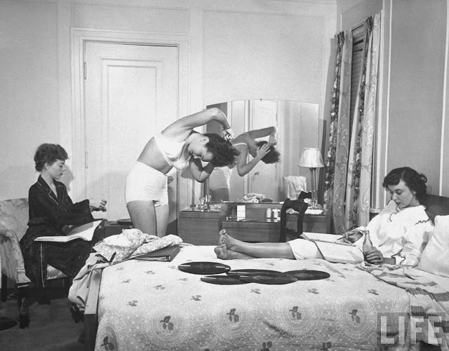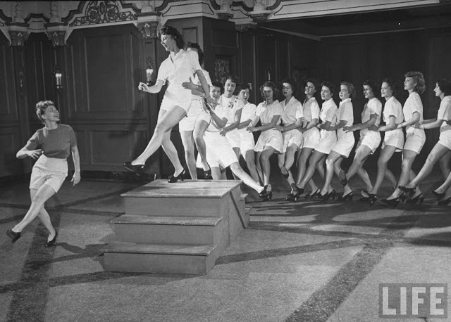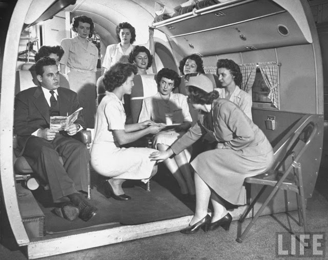 Here, photos taken at the McConnell Air Hostess School which trained air hostesses for TWA in the 1940s. The training included learning the correct way to serve drinks, dealing with inebriated passengers and even learning how to change nappies. Even more surprisingly they are also pictured having chewing gum to reduce that double chin, having their posture checked, doing the conga and having a bubble bath.