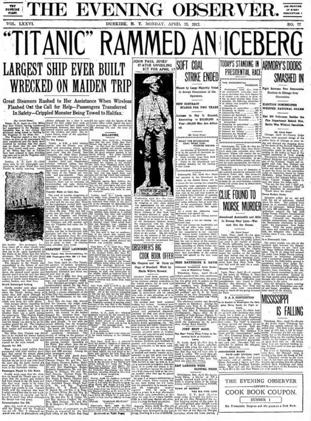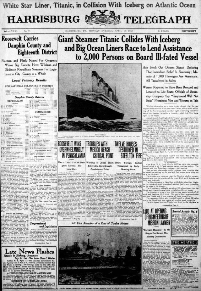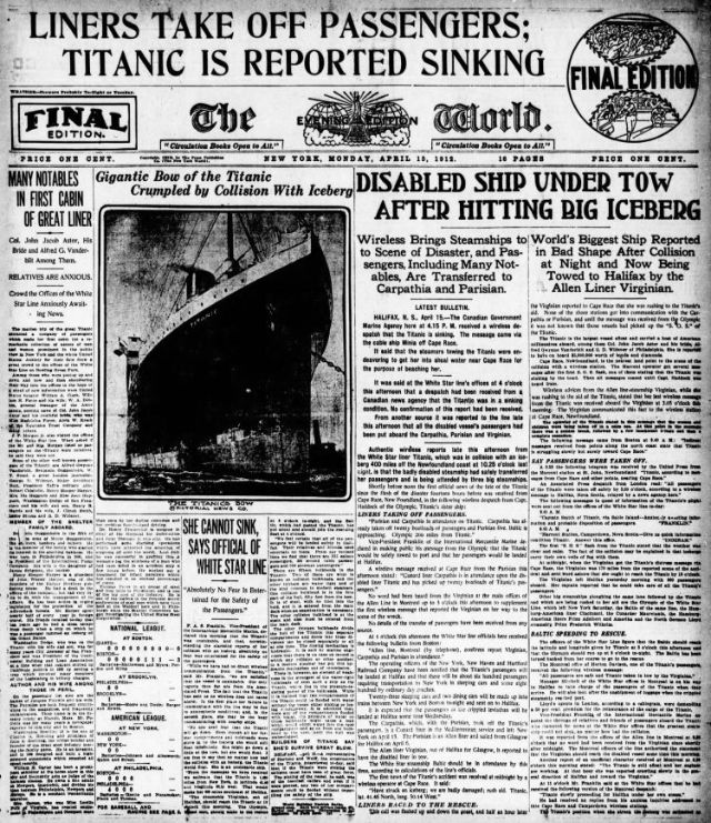 Titanic’s Passengers Saved; Liner Sinking (The Oakland Tribune).White Star Liner Titanic, Biggest Steamship Afloat, Strikes Iceberg on First Trip and Is Sinking (The Hartford Courant).Titanic Smashes Iceberg; 1,470 Saved (The Binghamton Press).“Titanic” Rammed an Iceberg (The Evening Observer).White Star Liner Titanic Strikes an Iceberg — Passengers Are Safe and the Vessel Is in Tow (The Elmira Star-Gazette).Passengers of Titanic Transferred in Safety to Parisian and Carpathia (The Bridgeport Evening Farmer).Iceberg Wrecks Titanic (The Daily Gate City).All Titanic Passengers Are Safe; Transferred in Lifeboats at Sea (The Evening Sun).Liners Taking Off Passengers; Titanic Is Reported Sinking (The Evening World).Titanic Hits Iceberg; People Safe (The Seattle Star).Wireless Saved Titanic’s Passengers: 2210 Persons Taken From Great Liner by Rescuers (The St. Louis Star).Titanic Survives Iceberg Crash Tho Badly Damaged; Passengers Safe (The Asbury Park Evening Press).Biggest Ship Afloat Sinking in Mid-Ocean (The Great Falls Daily Tribune).White Star Liner, Titanic, in Collision With Iceberg on Atlantic Ocean (The Harrisburg Telegraph).Frantic Crowds Storm White Star Offices for Titanic News (1912).Titanic Unsinkable: She Cannot Sink, Says Official of White Star Line (The Evening World (New York, NY) April 15, 1912, Final Edition).