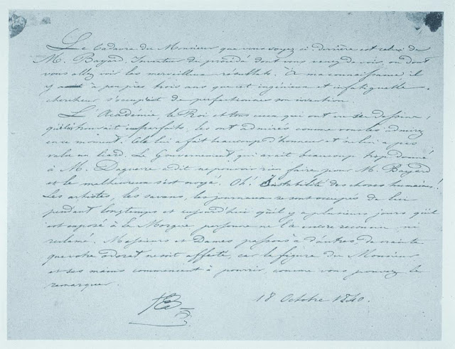 “The corpse which you see here is that of M. Bayard, inventor of the process that has just been shown to you, or the wonderful results of which you will soon see. As far as I know, this inventive and indefatigable experimenter has been occupied for about three years with the perfection of his discovery. The Academy, the King, and all those who have seen his pictures admired them as you do at this very moment, although he himself considers them still imperfect. This has brought him much honor but not a single sou. The government, which has supported M. Daguerre more than is necessary, declared itself unable to do anything for M. Bayard, and the unhappy man threw himself into the water in despair. Oh, human fickleness! For a long time, artists, scientists, and the press took interest in him, but now that he has been lying in the morgue for days, no-one has recognized him or claimed him! Ladies and gentlemen, let’s talk of something else so that your sense of smell is not upset, for as you have probably noticed, the face and hands have already started to decompose.”
