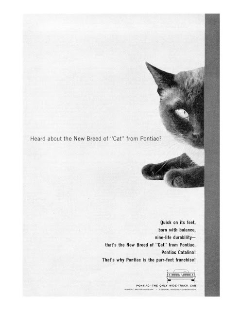 It’s a daring move to make the cropped photo of the cat that big and the line drawing of the 1961 Pontiac that small in this ad. Though I’d read that the Catalina was named for Santa Catalina Island (typically just called Catalina) off the California coast, and not for a feline, the comparisons are clever.