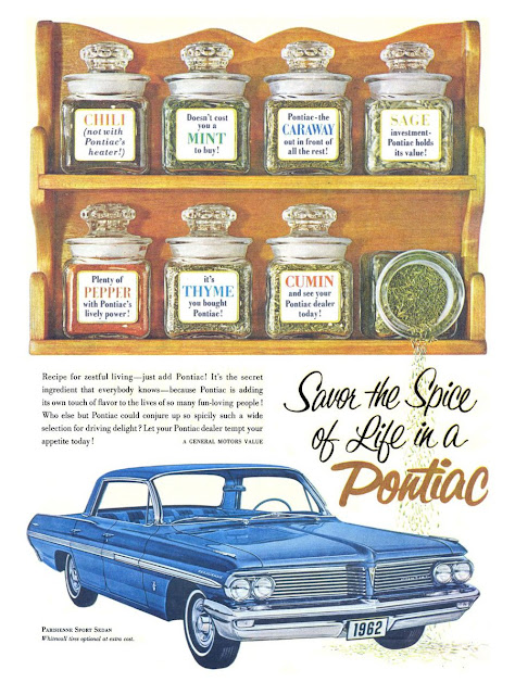 This pun-filled 1962 Pontiac Parisienne “recipe for zestful living” ad goes to 11—Pontiacs that is. Making the spice rack and jars so large relative to the car was a bold step, but no reader will forget the brand, as “Pontiac” is repeated on six of the eight bottles, and five more times below them.