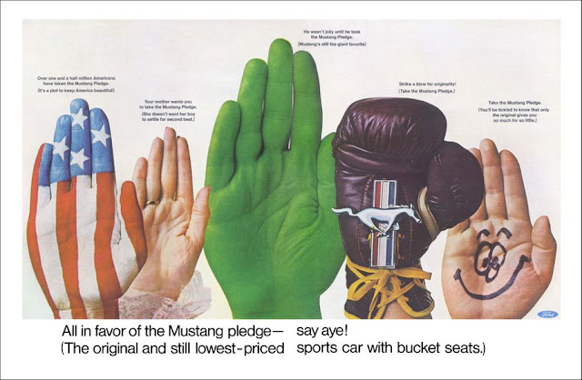 It’s all hands and no car in this 1967 Mustang ad. The “Mustang Pledge” included a list of things that the owners promised to do and some they wouldn’t do. The big green hand, a veiled tie-in to the Jolly Green Giant of garden vegetables fame, seems strange today.