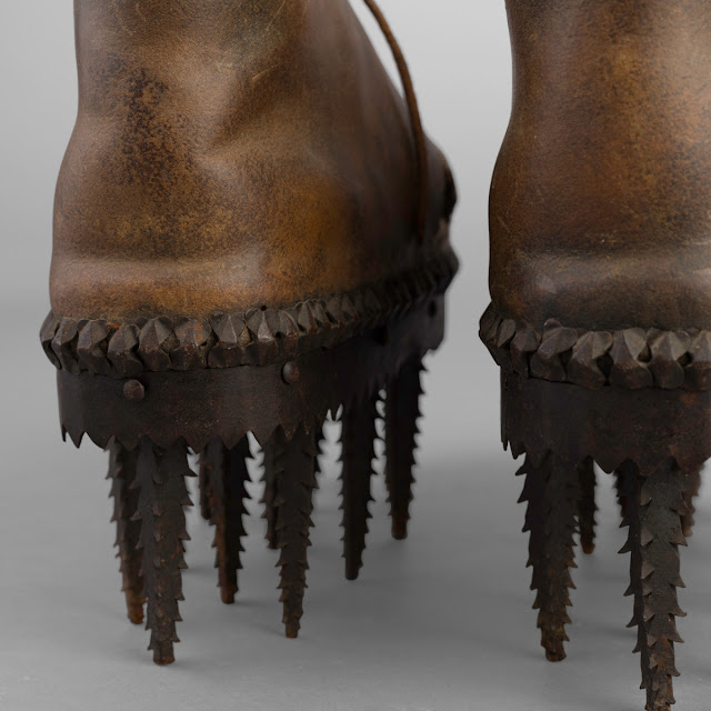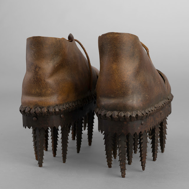 This footwear, called “Soles”, made in the Ardèche region of France in the 19th century. The soles are heavy duty shoes whose soles are studded with sharp blades. They were in wood for the sole, leather for the portion covering the foot and metal for the dents.