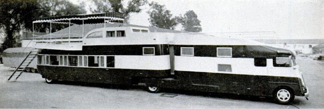 The front motorhome unit had a 26-foot wheelbase and held the more important things like the kitchen and bathroom. The back section, the actual mobile home, was similar to an articulated 5th wheel unit and had all the fun stuff: an observation lounge, a sun deck that could withstand a helicopter landing, a portable six-foot-deep inflatable swimming pool with a diving board, an extendable sundeck, air-conditioned dining nook, and bar. It was the ultimate party (and work) mobile.