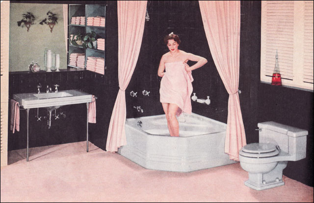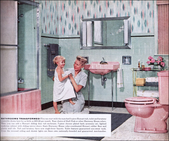 1957 Sears Bathroom – This is a standard pink and green color scheme offered by Sears Roebuck. Until the mid 1950s, ads by Sears are a rarity, but by 1957 they appear regularly in Better Homes & Gardens. This ad was very midcentury and very middle class.