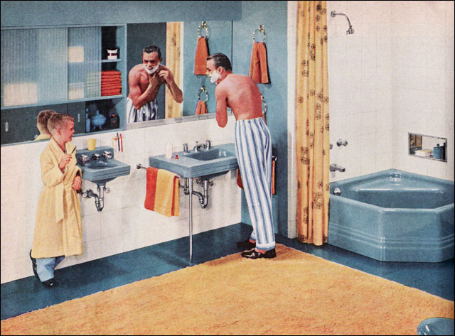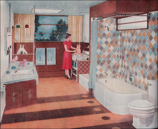 1953 Crane Bathroom – This bathroom, shown in Better Homes & Gardens, was designed to be divided. When the kids got all growed up, then Mom and Dad would be able to put a wall down the middle, between the two tubs, effectively creating a master bath and a family bathroom accessible from the hallway. The brown, blue, and grey scheme is a departure from the most popular color schemes.