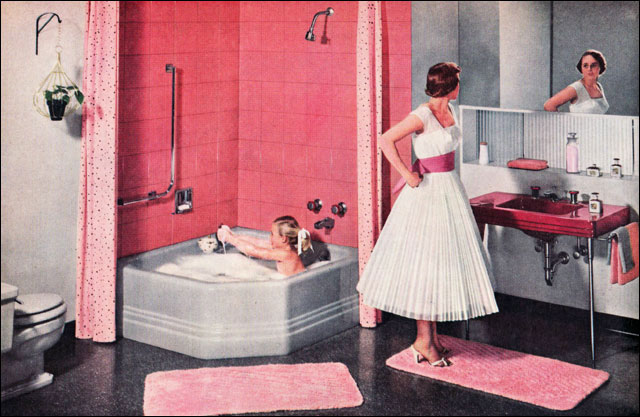 1956 American Standard Bathroom – By 1956 American Standard had moved on to a new series. These usually have a parent and child in the bathroom together. Here in this marvelous gray and pink scheme, Mom primps for a party while Susie takes her bath in the wonderful corner tub.