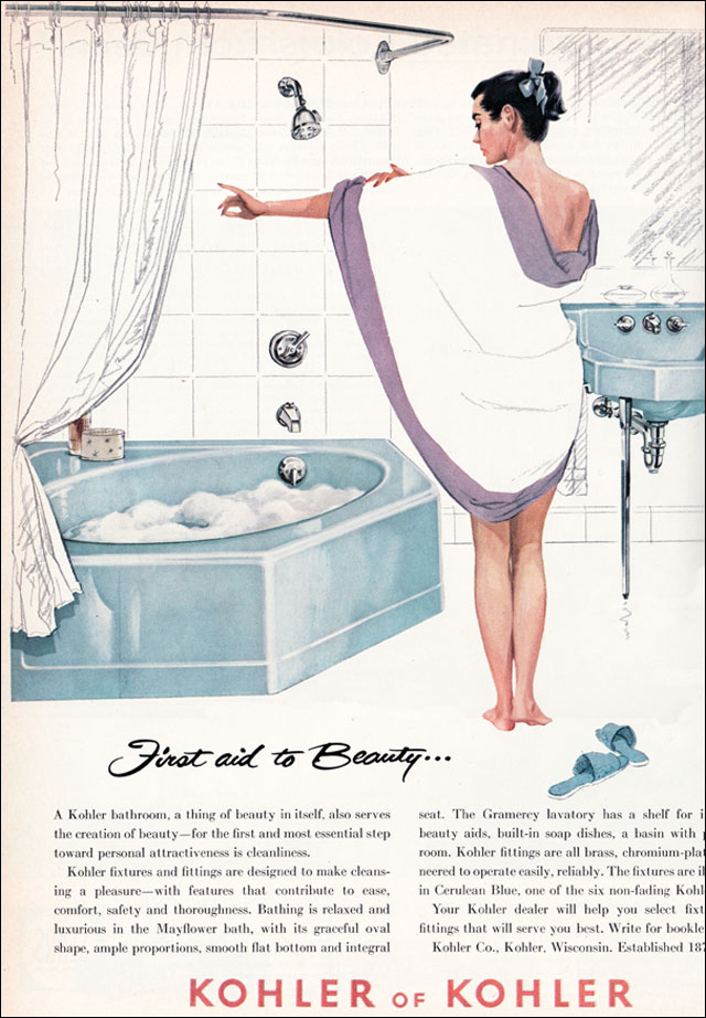 1957 Kohler Bathroom – As we go through midcentury advertising and articles looking for examples, we are often struck by the beauty of the advertising itself. This new series of Kohler illustrations feature the fixtures of course, but also a new style in their advertising. This particular ad reminds us of some of the great early 20th century illustrators like Coles Phillips and his Fadeaway Girls. The white, dusty amethyst, and sea blue scheme is beautiful.