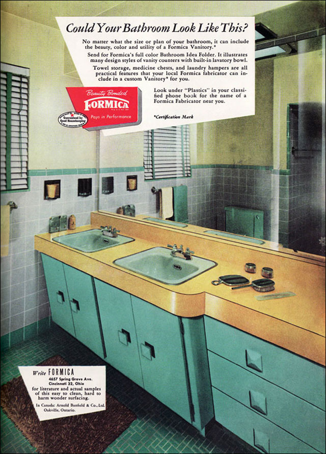 1952 Formica Bathroom – We found this advertisement in American Home magazine. Chartreuse, light gray, yellow, and turquoise combine in a bright, eyepopping color scheme guaranteed to wake you up in the morning. Laminates for counters became a popular finish during the 1950s because they came in a huge array of colors and patterns, but most importantly because they were so easy to clean.