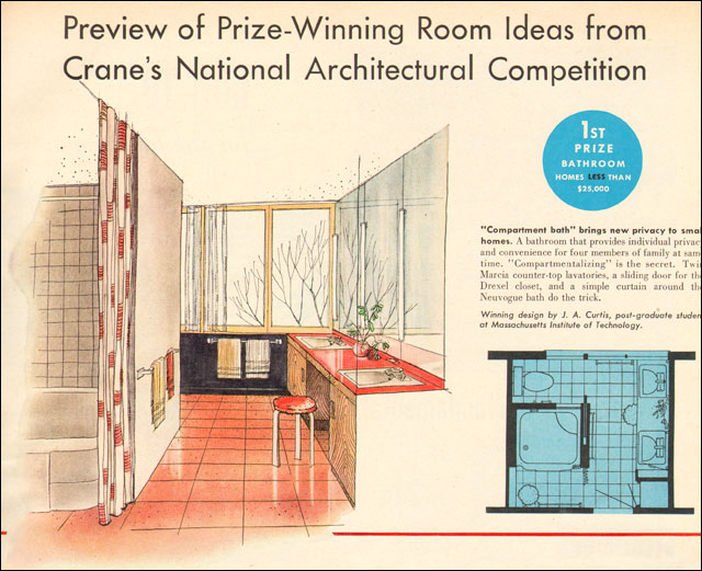 1953 Crane Bath Contest Winner – Here’s a rendering of a bathroom by a post-grad student at MIT that won a Crane competition. We like the clean lines and simple layout in a small footprint. The mirrors and windows make it very bright and the black, white, and orange scheme is unusual. We think the design is timeless and could easily be reproduced today.