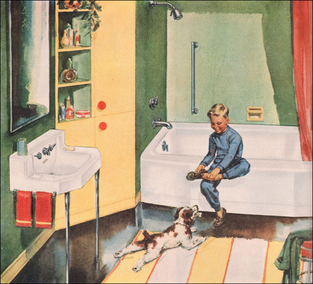 1953 Kohler Bathroom – Most of us would probably have a cow if we saw little Timmy using the toilet brush to shoot his Indian. This ad by Kohler is part of a series that ran during the early 1950s showcasing cute kids.