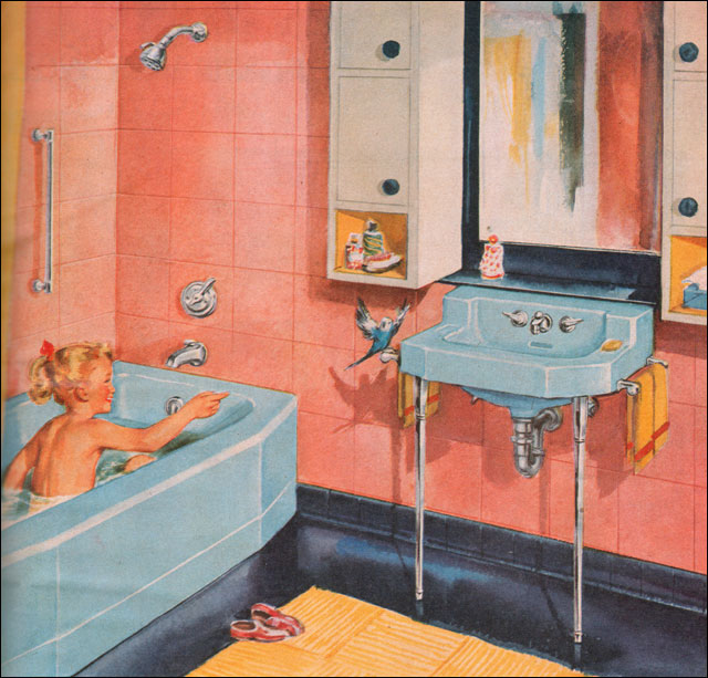 1953 Kohler Bathroom – We aren’t sure about the sanitary aspect of the parakeet loose in the bathroom, but enjoy the charm of this Kohler ad nevertheless. This bathroom is shown in Caribbean brights including sky blue, mango, and coral pink.