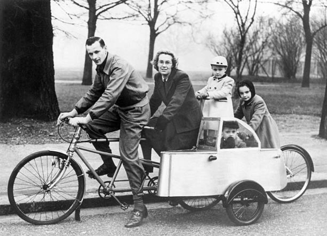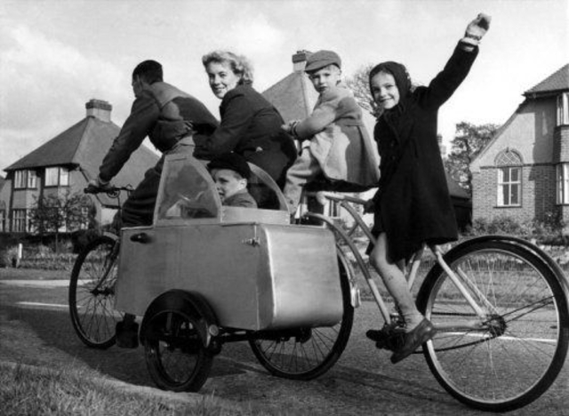 Mr. Eric Jewell, of Dukes Avenue, Finchley, London, finds the solution to go with his whole family to the countryside: a five seat bike.