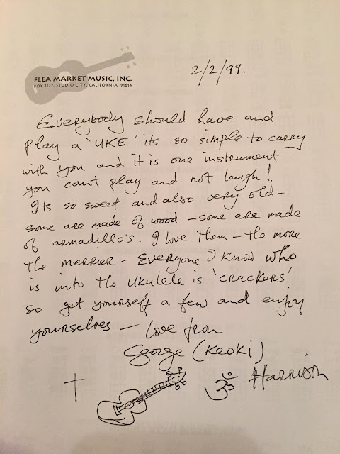 ‘Crackers’ may be the perfect word for Harrison’s uke-philia; he used it himself in the adorable note above from 1999. “Everyone should have and play a ‘UKE.’ It’s so simple to carry with you and it is one instrument you can’t play and not laugh!” He carried his uke with him and gave away ukes to friends whenever he could. “Everyone I know who is into the ukulele is ‘crackers,’ so get yourself a few and enjoy yourselves,” he said. Good advice from a Beatle. This course offers an introduction to playing the ukulele.