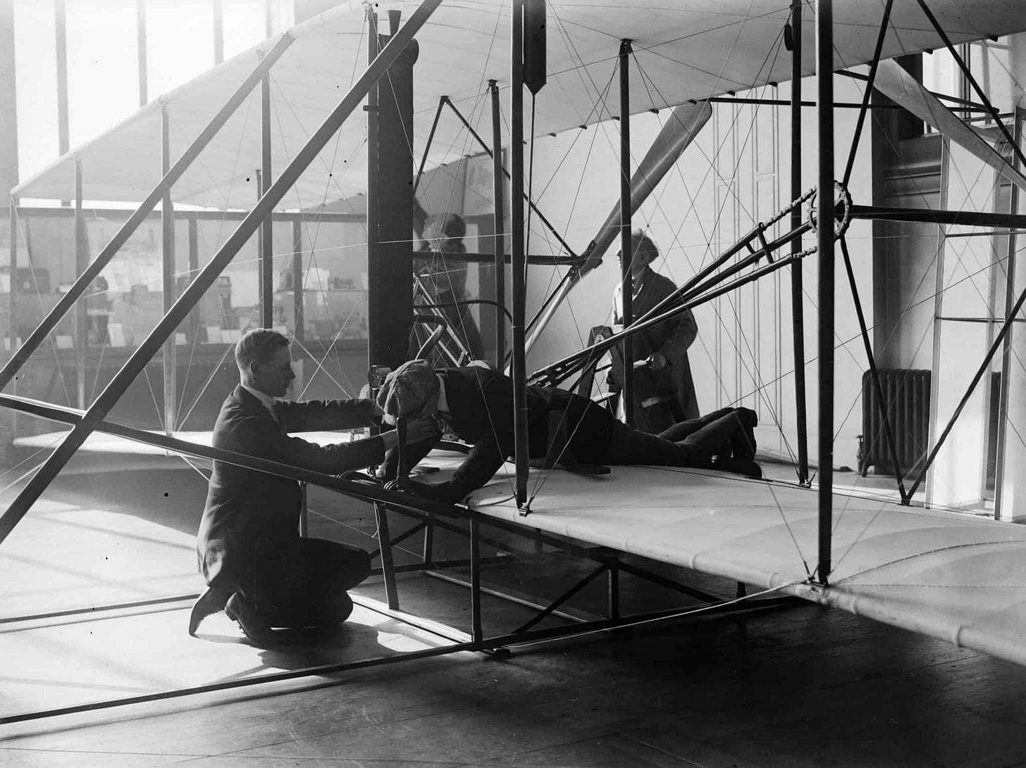 Workers at the Science Museum in London are busy adding a dummy figure to the famous biplane that the Wright brothers invented and flew in back in 1903. This photograph was taken in the 1920s.