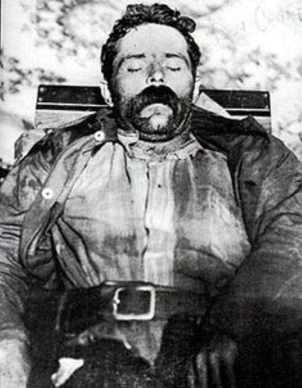 American outlaw Frank James (second from left) and others pose over the dead body of famed outlaw Jesse Jame, who was lying in his $500 casket at the Sidenfaden Funeral Parlor in St. Joseph, Missouri, on April 4, 1882, one day after his assassination.