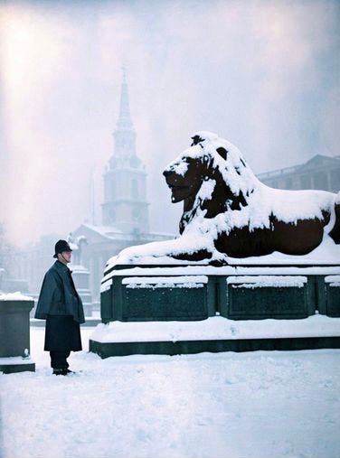 A policeman looks at one of the lions of Nelson’s Column majestically cloaked in a layer of snow. London, 1947.