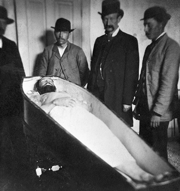 American outlaw Frank James (second from left) and others pose over the dead body of famed outlaw Jesse Jame, who was lying in his $500 casket at the Sidenfaden Funeral Parlor in St. Joseph, Missouri, on April 4, 1882, one day after his assassination.