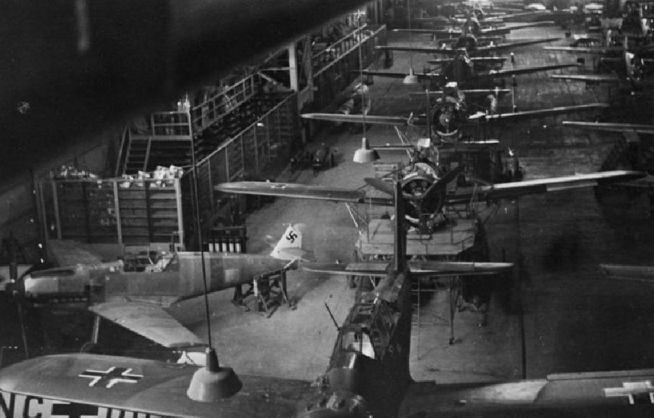 Image: An aircraft production and maintenance facility inside Germany during World War II. On the production line, several Arado Ar 196 are in a workshop/hangar.
