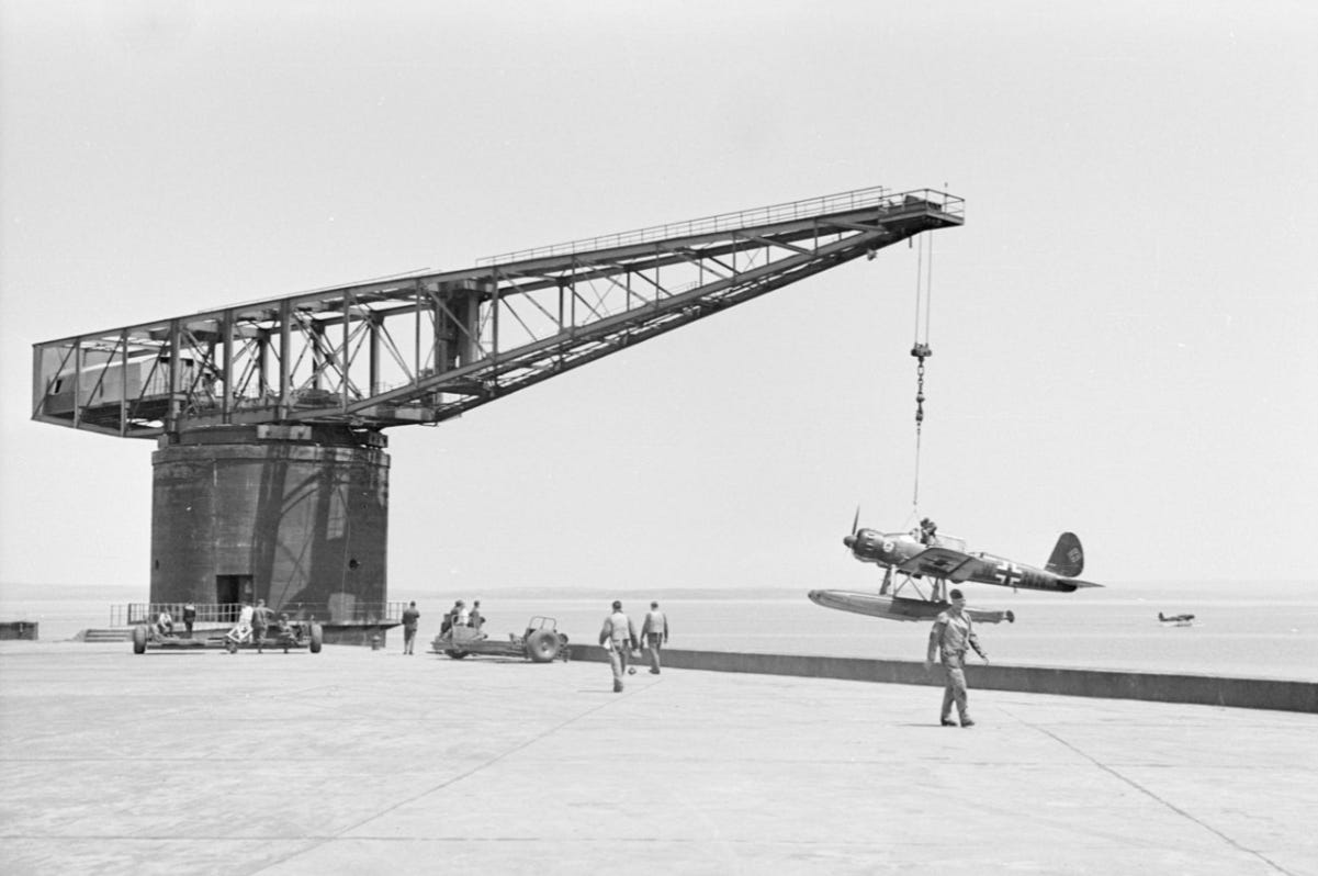 Image: This image captures a German Arado Ar 196 floatplane being lifted by crane at the Seefliegerhorst (naval air station) in Brest, an important Kriegsmarine base on the Atlantic coast of occupied France. The aircraft, bearing the tactical code 6W+NN, was part of a coastal aviation unit tasked with reconnaissance, convoy tracking, and maritime patrol.