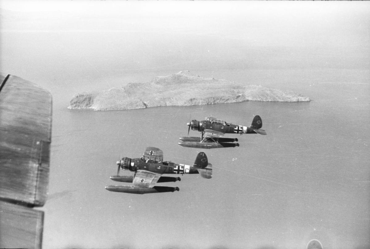 Image: This photograph captures a German Arado Ar 196 floatplane executing a landing maneuver near the island of Crete in 1943, as part of Luftflotte Südost (Air Fleet Southeast).