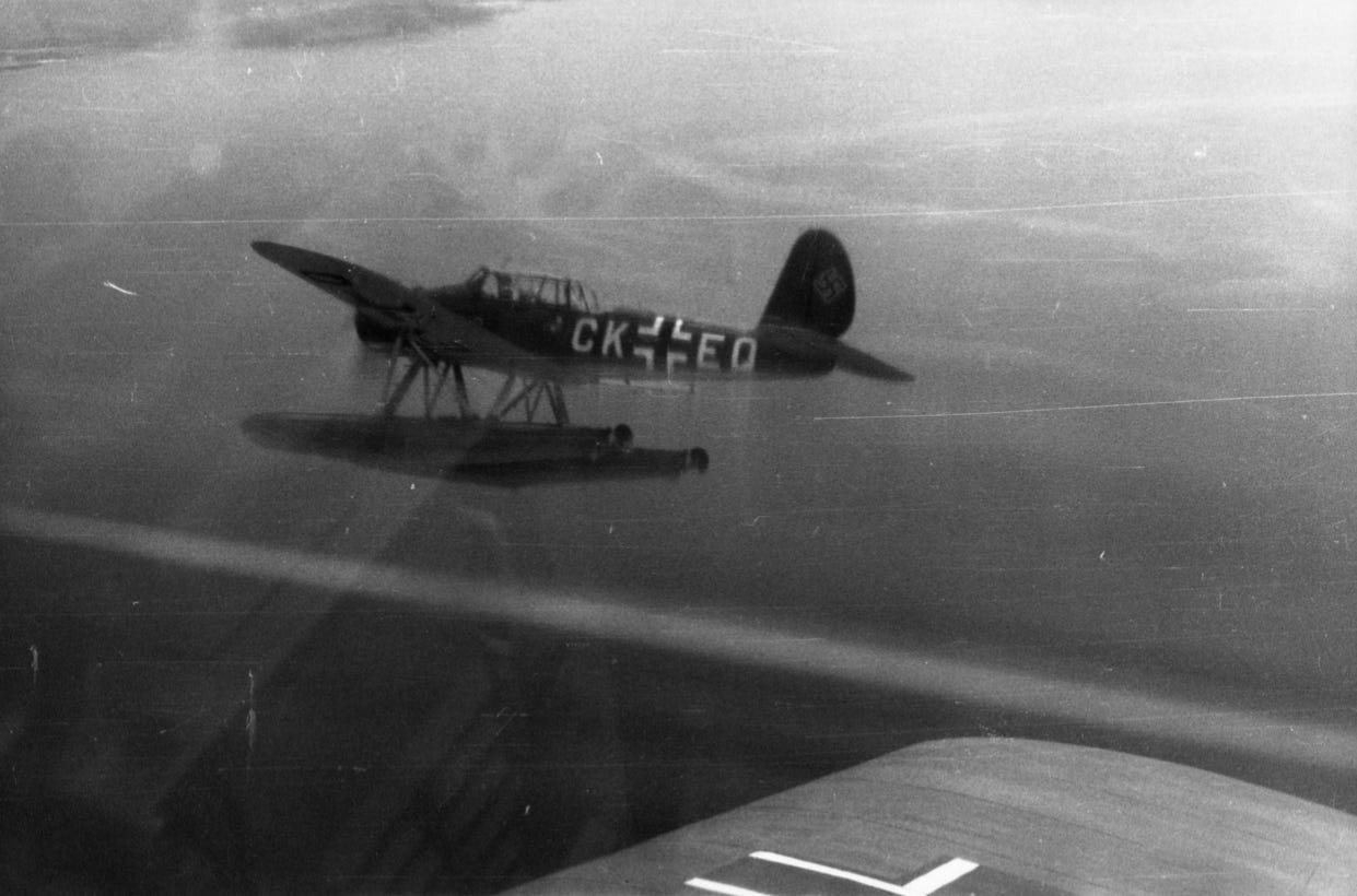 Images: These images capture Arado Ar 196’s, the standard shipborne reconnaissance floatplane of the German Kriegsmarine, in flight over the Danish coastline in 1940. The aircraft bears the tactical code CK+EQ, identifying it as part of Küstenfliegergruppe 706, a coastal aviation unit stationed at Aalborg-See (Aalborg Seaplane Base)in northern Denmark, shortly after the German occupation of that country in April 1940. The Ar 196, often commended for its strong and sturdy construction, easy low‑speed handling, and ability to operate from both catapult-equipped warships and coastal seaplane bases, made this particular floatplane an indispensable tool for the Kriegsmarine. Its silhouette—twin floats, braced wings, and compact fuselage—became an iconic presence along the North Sea and Baltic littorals during the early part of the war.