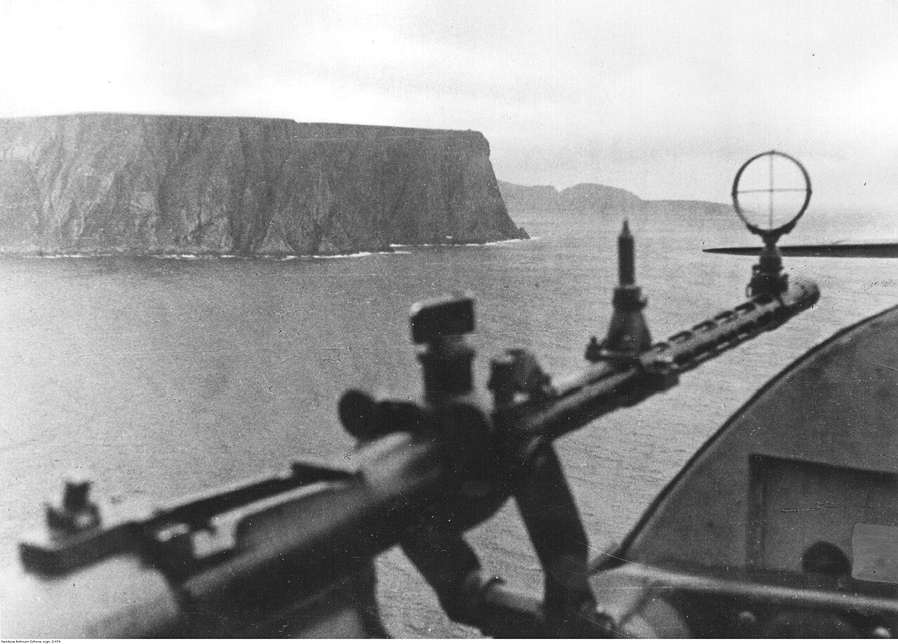 Image: The view of North Cape – or Nordkapp – which sits at the extreme northern edge of Norway, on the island of Magerøya in Finnmark county. North Cape is a dramatic 307‑metre cliff overlooking the Barents Sea and is often described as “the end of Europe.” This view, from the gunner’s position, is of an MG-15 machine gun, calibre 7.9 mm, in a German Arado Ar 196 aircraft flying over this magnificent site.