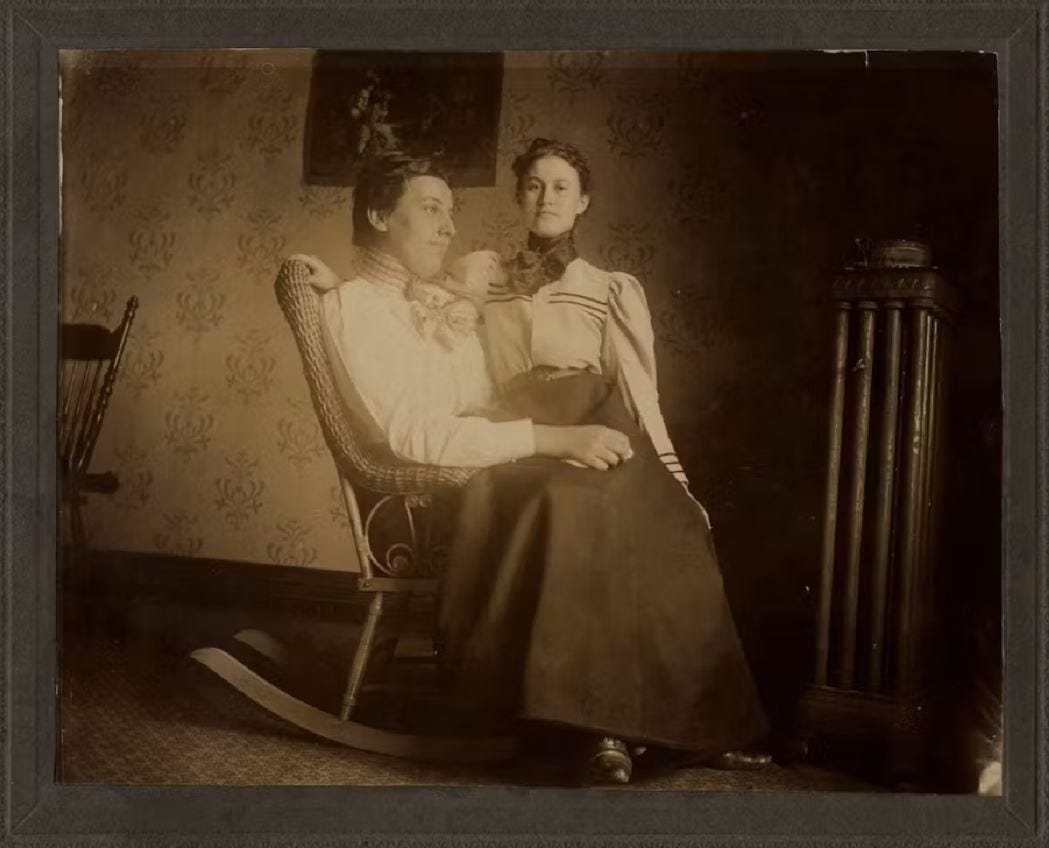 Image: Two students sharing a rocking chair at Macalester College, Minnesota. 1890s.