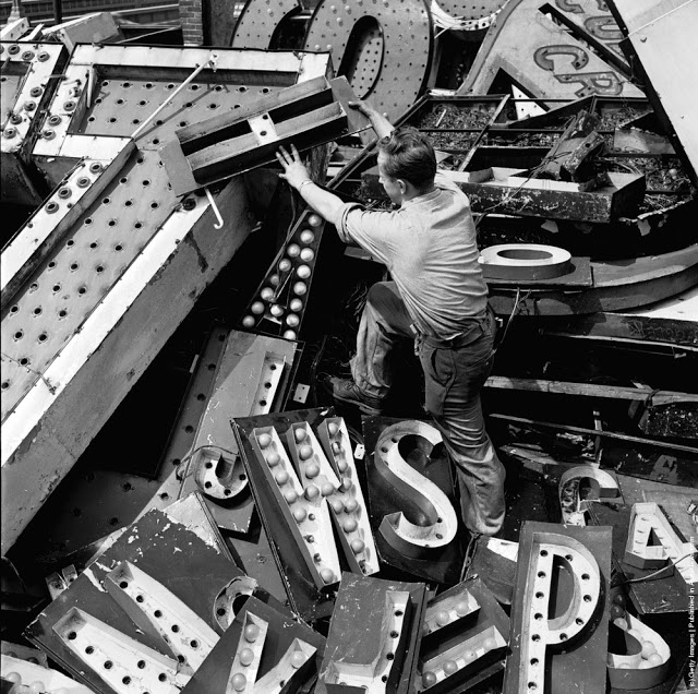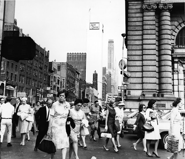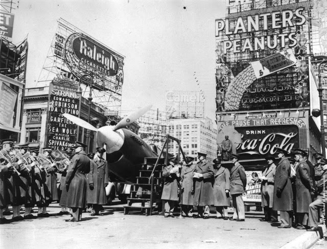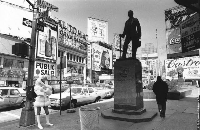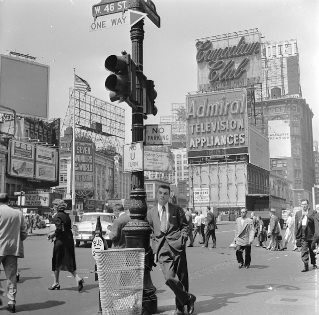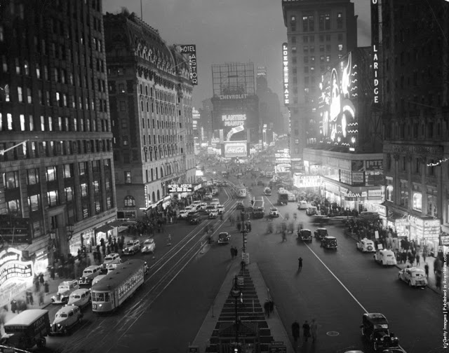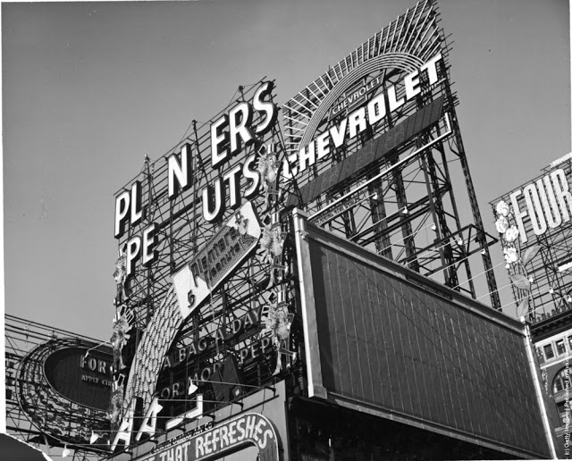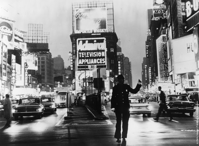Looking towards the Times Building on Times Square, the Paramount Building is on the right, and Seventh Avenue on the left crossing Broadway, 1930.Broadway looking towards Times Square in New York. 8th February 1934.Paramount Building in Times Square, New York, towers over Schenleys Chinese Restaurant, 1936.An overhead view of Times Square at night, New York City, New York, 1937.A view of the Planters Peanuts illuminated sign at the intersection of Broadway and 7th Avenue, Times Square, New York City, New York, 1940.A military band and a Curtiss P-40 Army Pursuit plane in Duffy Square on the corner of Times Square in New York. The plane is part of an exhibition to encourage men to join the Army Air Corps. 10th April 1941.Crowds celebrate VE day in Times Square, New York. 8th May 1945.A rear veiw of a soldier on crutches in a crowd in Times Square on VJ Day, New York City, August 1945.A pretzel vendor selling his wares from a wicker basket in the Times Square and Broadway area of New York, 1947.An information seeker speaks into a microphone at a police information booth at Times Square, New York. 14th March 1949.Old signs reclaimed by neon sign making company Art-Craft Strauss, circa 1950. Many of their signs adorn New Yorks Times Square.A salesman bides his time in Times Square, Manhattan, New York, 1950.A night street scene at 47th Street near Times Square, showing night club and theater signs, New York City, New York, 1958.Choristers from a Norwegian choir on a visit to New York take photographs in Times Square, 1956.A Beth David Hospital ambulance on call in Times Square, 1956.A group of majorettes parading in the Thanksgiving Parade near Times Square, New York. 26th November 1961.Crowds of pedestrians walk at the intersection of Eighth Avenue and 42nd Street, with the Allied Chemical building visible in the background, New York City, 1962.A gigantic litter basket in Times Square, New York with a sign saying, [Just a Drop in the basket keeps New York Clean]. Another signe threatens a 25 fine for any litterbug caught by the Sanitation Police Flying sqaud. 18th March 1964.Two butchers stop to chat after buying hot dogs from a street vendor in the Times Square area of New York, 1965.A policeman directs traffic in front of the famous neon billboards of Times Square in New York City, at its intersection with Broadway, 1965New York nightclub owner Jack L Hickman spends his free time marching around Times Square with a sign that reads [The only good communist is a dead communist]. 26th April 1965.A woman sitting in a Times Square cafeteria, New York, 1968.Times Square, New York with the statue of theatrical impresario, George Cohan being studied by a fur coated, mini-skirted passer-by, 1969.Actress Linda Hayden on a bench in Times Square, New York, 1969.A man entering a barber shop under Times Square, New York, 1969.Two amputees take part in a parade through Times Square in New York City, to commemorate the end of the Vietnam War and honour those who took part in it. 6th April 1973.Exterior view of Circus Circus, an [adult amusement center], in Times Square as a man walks past wearing a hat and carrying his coat over his arm, New York, New York, 1975. The marquee advertises exotic models, nude girls, books, magazines, games, and peep shows, as well as a juice bar and [high-potency protein health drinks].A porn shop with films and live shows near Times Square, New York, 1975.Shoppers on West 42nd Street between 7th and 8th Avenues in the Times Square area of New York. 12th October 1975.Clean washing hanging out to dry above a laundry one block west of the more glamorous Times Square, New York, 1977.
