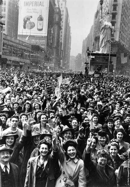 On May 8, 1945, a massive crowd celebrated Victory in Europe Day in Times Square; and on August 15, 1945, the largest crowd in the history of Times Square gathered to celebrate Victory over Japan Day. The victory itself was announced by a headline on the “zipper” news ticker at One Times Square, which read “*** OFFICIAL TRUMAN ANNOUNCES JAPANESE SURRENDER ***”, the six asterisks representing the branches of the U.S. Armed Forces.
