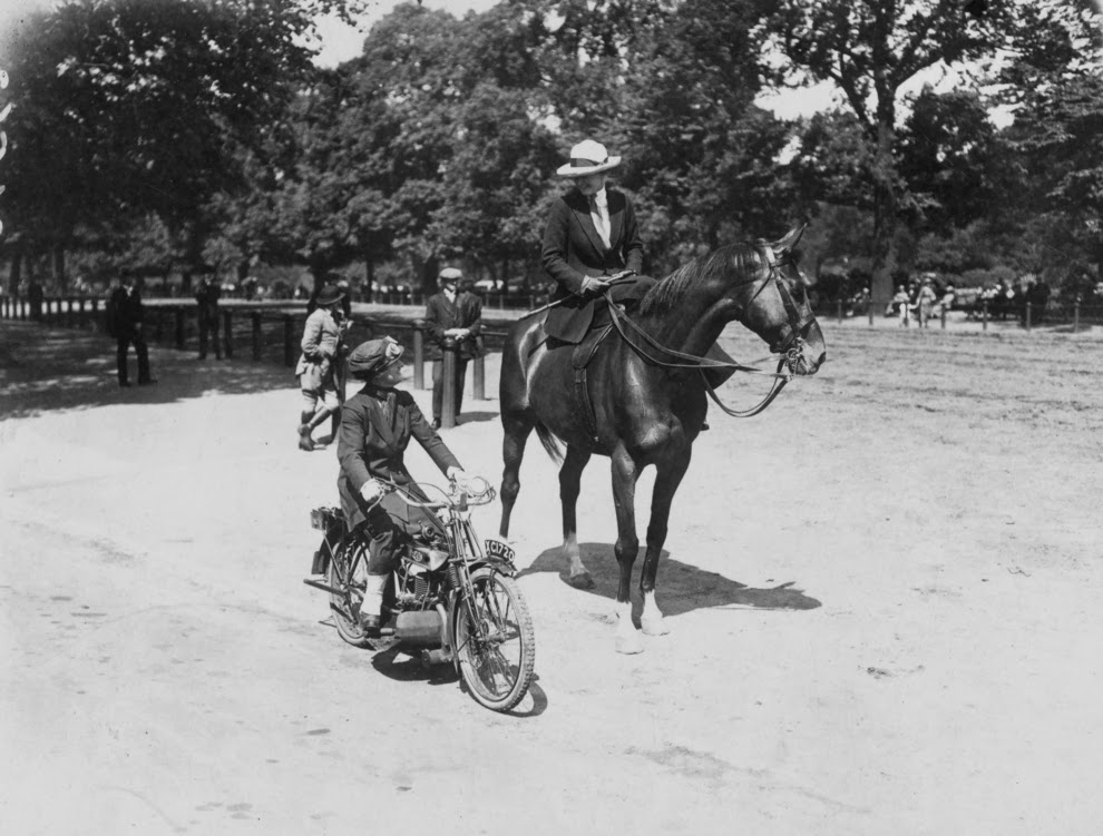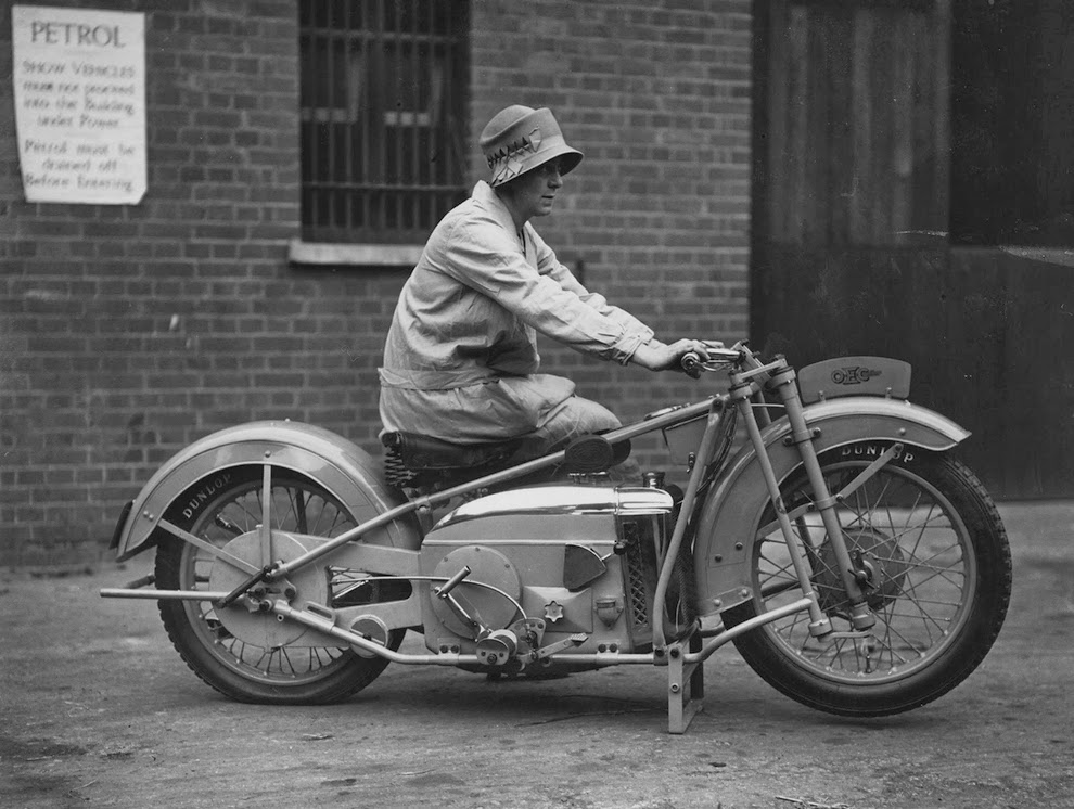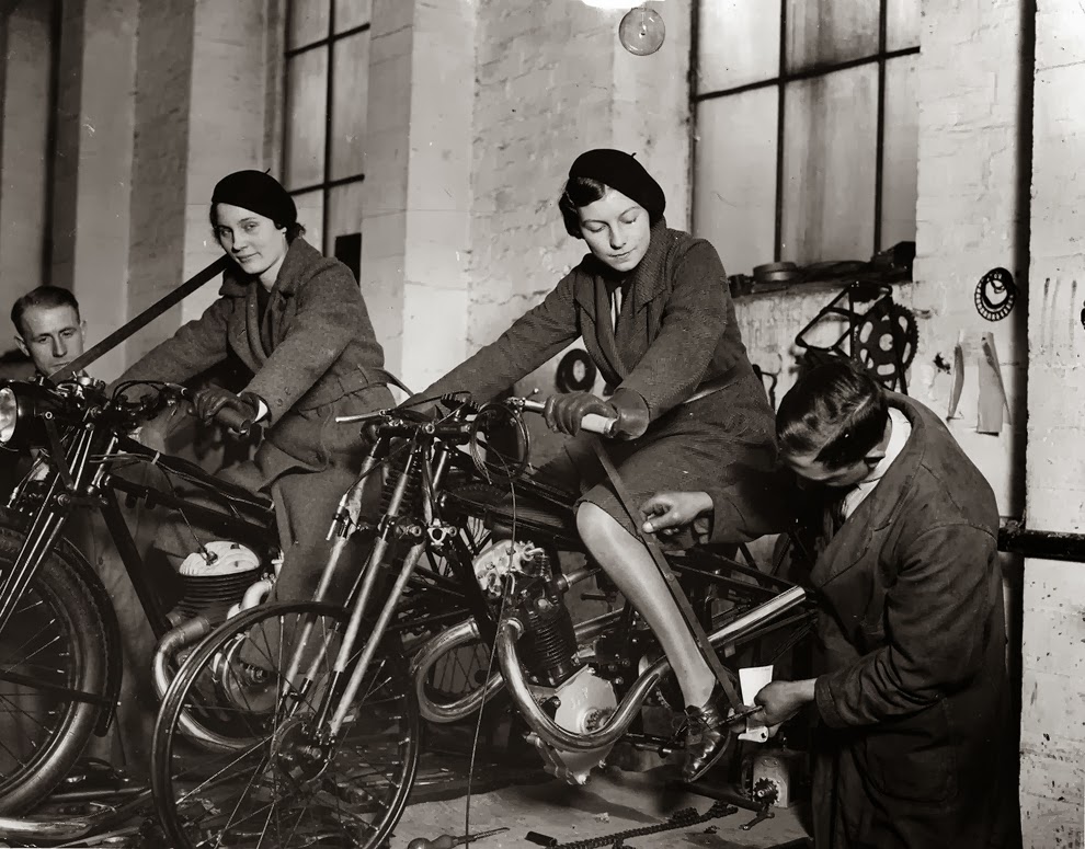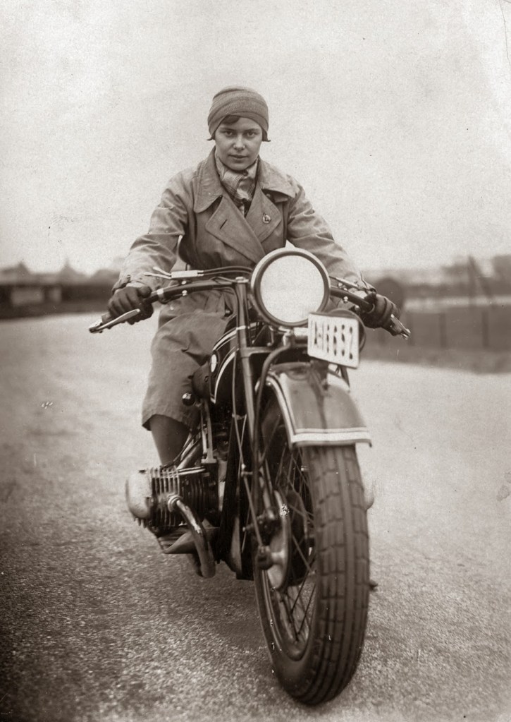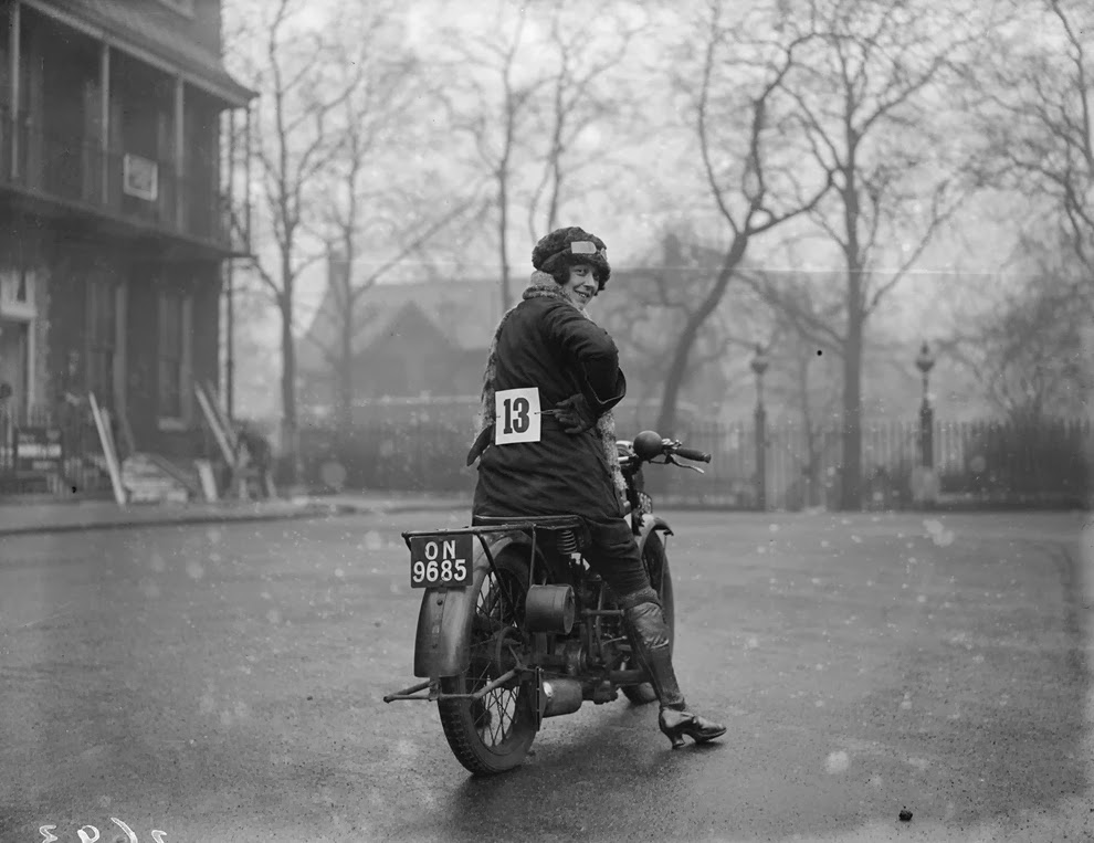 Marjorie Cottle (second from left), a famous motorcyclist, and friends in Germany, 1920.Madge Saunders and her husband, British comic actor Leslie Henson, 1920.A woman on her BMW motorcycle, 1935.Sally Halterman, the first woman to be granted a license to operate a motorcycle in the District of Columbia, 1937.An entrant in a ladies-only reliability trial in London, England, 1927.Three women riding motorbikes at the ACU Trials in Birmingham, England, 1923.A woman riding a motorcycle alongside a woman on a horse in London, 1921.Nancy and Betty Debenham, well-known motorcyclists, riding BSA bikes with their dog, 1925.Marjorie Dare (Doris Smith) riding hands free around “The Wall of Death” sideshow at the Kursaal amusement park in Essex, England, 1938.Marjorie Dare performing, 1938.Children being pulled along by a woman on a motorbike in London, 1926.A woman alongside her Harley-Davidson in California, 1925.A woman and a performing seal at a circus, 1935.Two women ready to play tennis on a BSA motorbike, 1925.A woman trying out a Douglas motorcycle on display at the 18th Cycle and Motorcycle Show in London, 1933.Workers measuring the positions of footrests and controls on partially finished motorcycles, 1933.Miss E. Foley and Miss L. Ball, entrants in the International Six Days Reliability Trials, at Brooklands race track in England, 1925.Nancy setting off for a motorcycle rally in England, 1934.A woman on a 500 OEC Tinkler All-Weather Model designed for use on rough roads and cross-country, 1928.A reverend blesses the motorcycle of a woman who is learning to drive, 1938.A woman rider in the Six Days Motorcycle Trial, in which competitors have to cover 200 miles a day over rough terrain, 1933.Women of Achille Serre Ltd’s Private Fire Brigade setting off on their motorcycle and sidecar to compete in the London Private Fire Brigades’ Tournament, 1925.