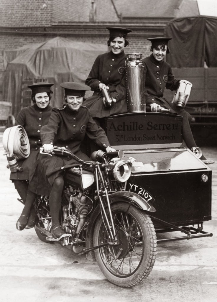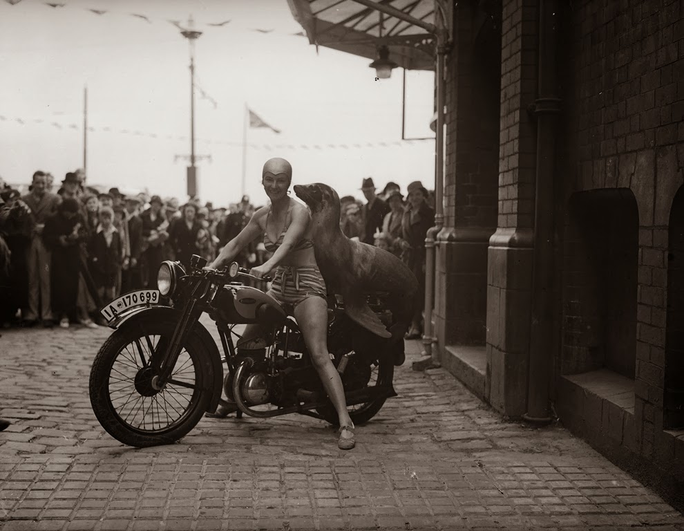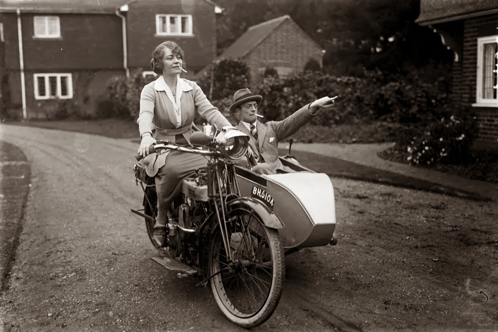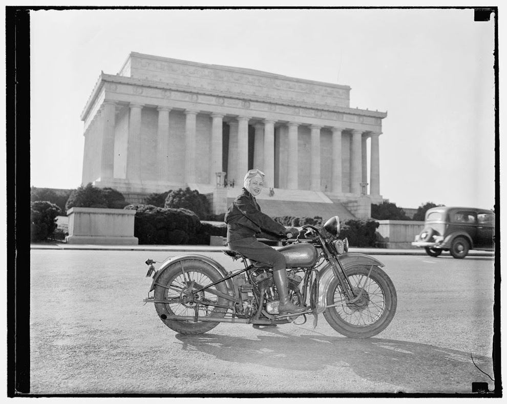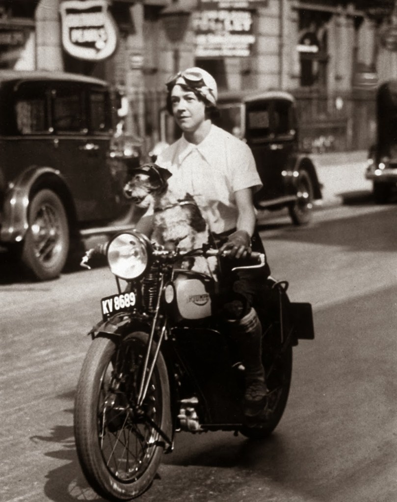 Marjorie Cottle (second from left), a famous motorcyclist, and friends in Germany, 1920.Madge Saunders and her husband, British comic actor Leslie Henson, 1920.A woman on her BMW motorcycle, 1935.Sally Halterman, the first woman to be granted a license to operate a motorcycle in the District of Columbia, 1937.An entrant in a ladies-only reliability trial in London, England, 1927.Three women riding motorbikes at the ACU Trials in Birmingham, England, 1923.A woman riding a motorcycle alongside a woman on a horse in London, 1921.Nancy and Betty Debenham, well-known motorcyclists, riding BSA bikes with their dog, 1925.Marjorie Dare (Doris Smith) riding hands free around “The Wall of Death” sideshow at the Kursaal amusement park in Essex, England, 1938.Marjorie Dare performing, 1938.Children being pulled along by a woman on a motorbike in London, 1926.A woman alongside her Harley-Davidson in California, 1925.A woman and a performing seal at a circus, 1935.Two women ready to play tennis on a BSA motorbike, 1925.A woman trying out a Douglas motorcycle on display at the 18th Cycle and Motorcycle Show in London, 1933.Workers measuring the positions of footrests and controls on partially finished motorcycles, 1933.Miss E. Foley and Miss L. Ball, entrants in the International Six Days Reliability Trials, at Brooklands race track in England, 1925.Nancy setting off for a motorcycle rally in England, 1934.A woman on a 500 OEC Tinkler All-Weather Model designed for use on rough roads and cross-country, 1928.A reverend blesses the motorcycle of a woman who is learning to drive, 1938.A woman rider in the Six Days Motorcycle Trial, in which competitors have to cover 200 miles a day over rough terrain, 1933.Women of Achille Serre Ltd’s Private Fire Brigade setting off on their motorcycle and sidecar to compete in the London Private Fire Brigades’ Tournament, 1925.